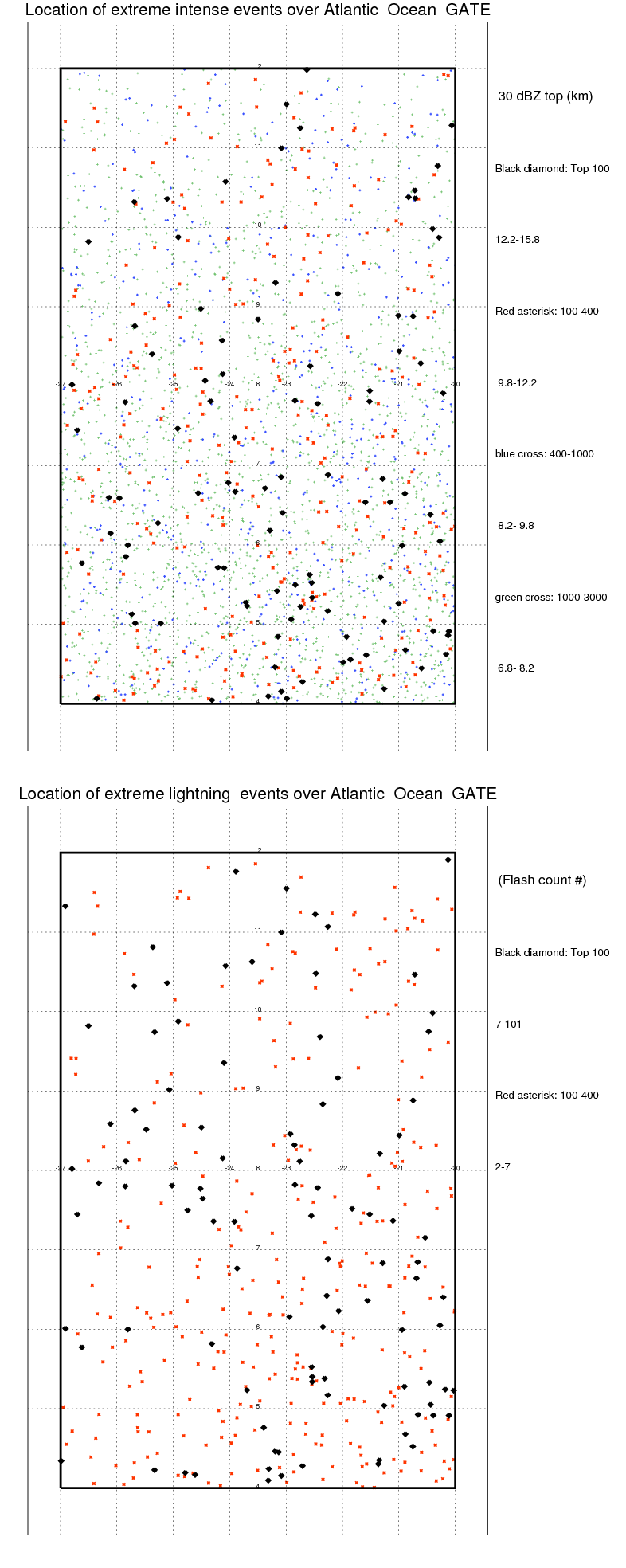 Following figure shows the location of the precipitation feautres categorized by the lightning rate and 30 dBZ echo top.