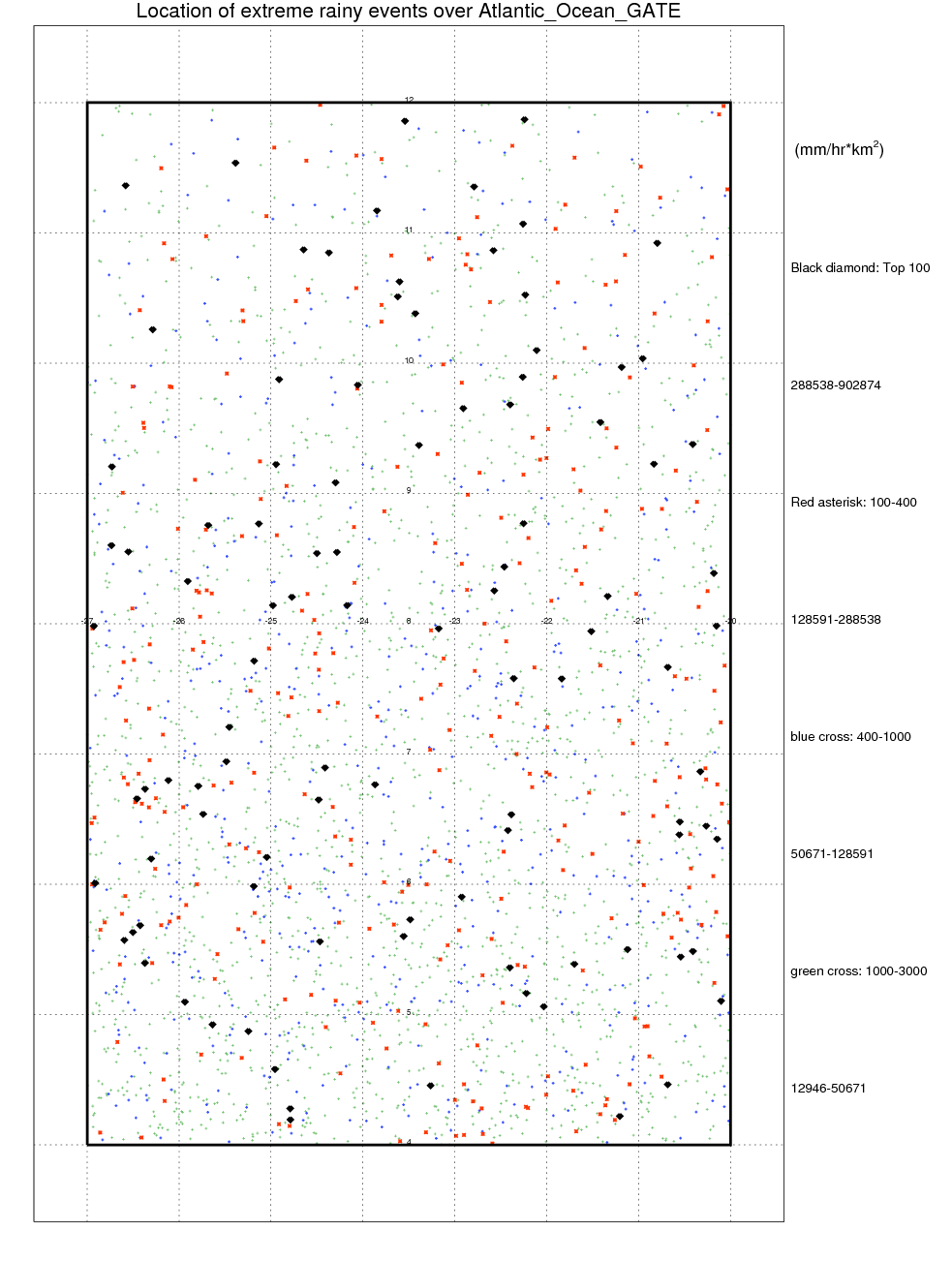 Following figure shows the location of the precipitation feautres categorized by the volumetric rainfall.