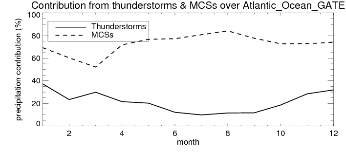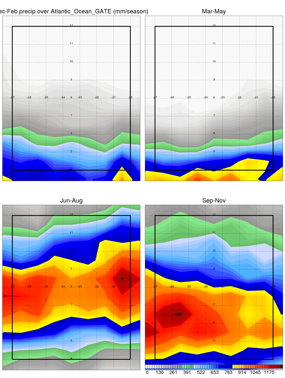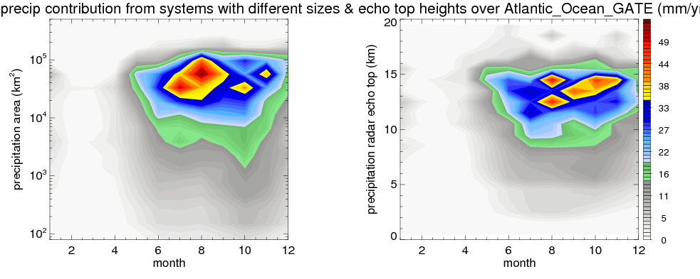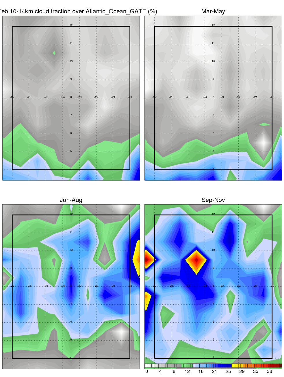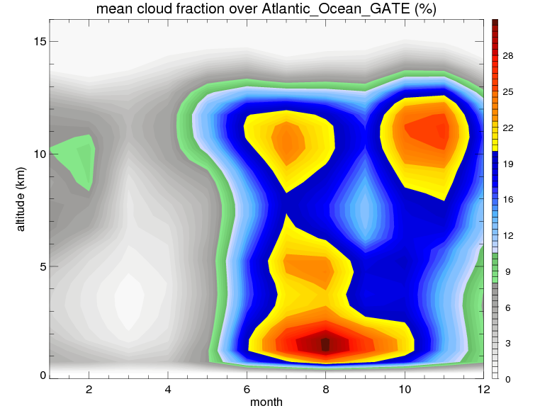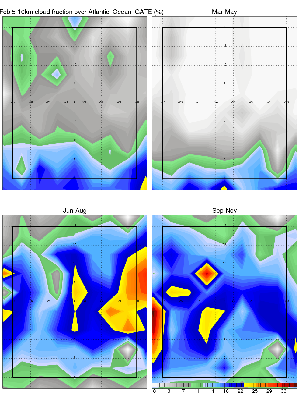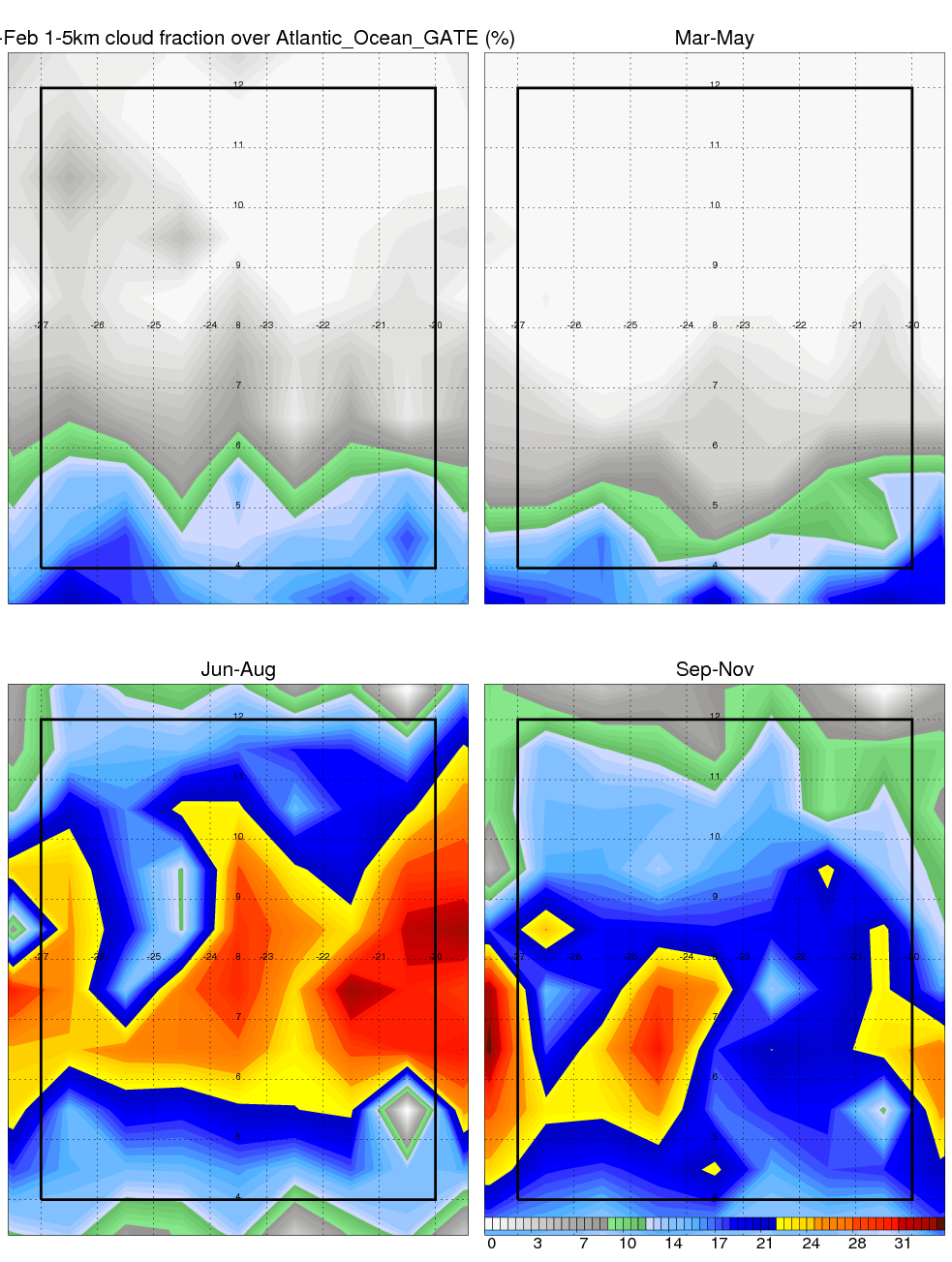 Over Atlantic_Ocean_GATE , mean annual precipitation are estimated with 1870.7 (mm/year) from TRMM precipitation radar. (distribution of precipitation see here ) Total surface rainfall is brought by various precipitation systems. The seasonal variation of precipitation from systems with different sizes and heights are shown below: In total, thunderstorms (systems with detected lightning flashes) contribute 17 %, MCSs (Mesoscale convective systems with raining area > 2000 km^2) contribute 76 % of all precipitation. Seasonal variations of fraction of precipitation from thunderstorms and MCSs are shown below: The seasonal variation of geographical distribution of CloudSat cloud fraction over Atlantic_Ocean_GATE is shown below: The seasonal variation of mean CloudSat level cloud fraction at different altitudes over Atlantic_Ocean_GATE is shown below: |