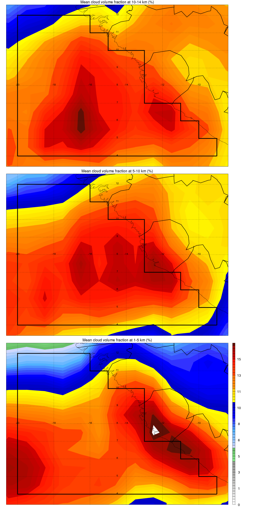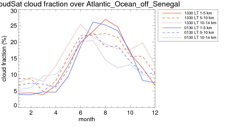 Over Atlantic_Ocean_off_Senegal , mean high level (10-14 km) cloud volume fraction is about 14.6%. Mean mid level (5-10 km) cloud volume fraction is about 14.3%. Mean low level (1-5 km) cloud volume fraction is about 13.8%. Seasonal and day vs. night variations of high, mid and low level cloud fraction over Atlantic_Ocean_off_Senegal are shown in following figure. You may check the details of cloud fraction in various seasons and at different local times. |