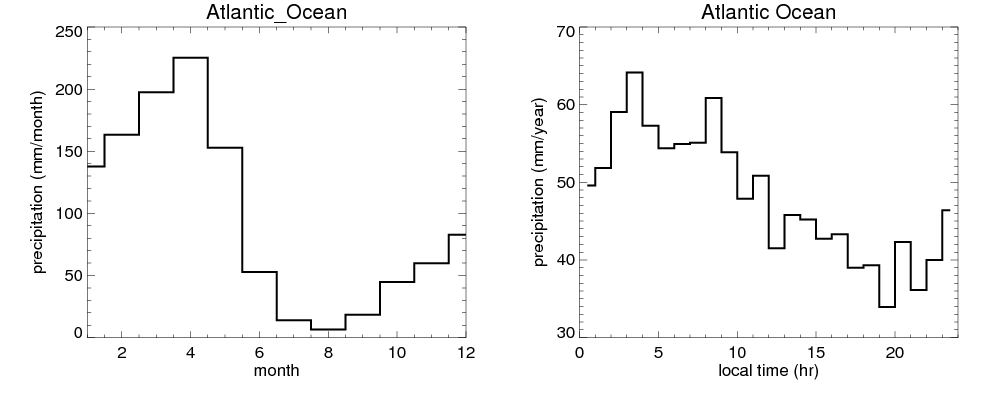 Over Atlantic_Ocean , mean annual precipitation are estimated with 1155.4 (mm/year) from precipitation radar, and 1003.8 (mm/year) from microwave radiometer observations. (see high resolution precipitation product , NOTE: it may take long time to generate for large area) In total, thunderstorms (systems with detected lightning flashes) contribute 14 %, MCSs (Mesoscale convective systems with raining area > 2000 km^2) contribute 63 % of all precipitation. Seasonal and diurnal variations of rainfall over Atlantic_Ocean are shown in following figure. You may check the details of rainfall contributions from precipitation systems with different sizes and intensities in various seasons and at different local times. |