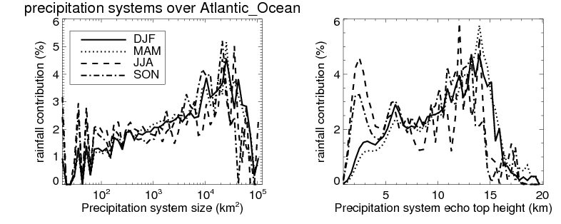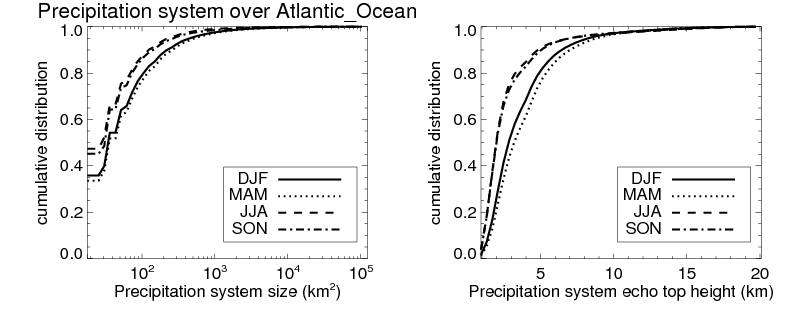 Over Atlantic_Ocean , mean size of precipitation system about 211.6 (km^2) and mean maximum radar echo top height of these precipitation systems is about 3.8 km. Following figure shows the cumulative distribution of the sizes and depths of the precipitation systems in different seasons: Though usually there are more small systems, the larger systems would bring more total precipitation. |