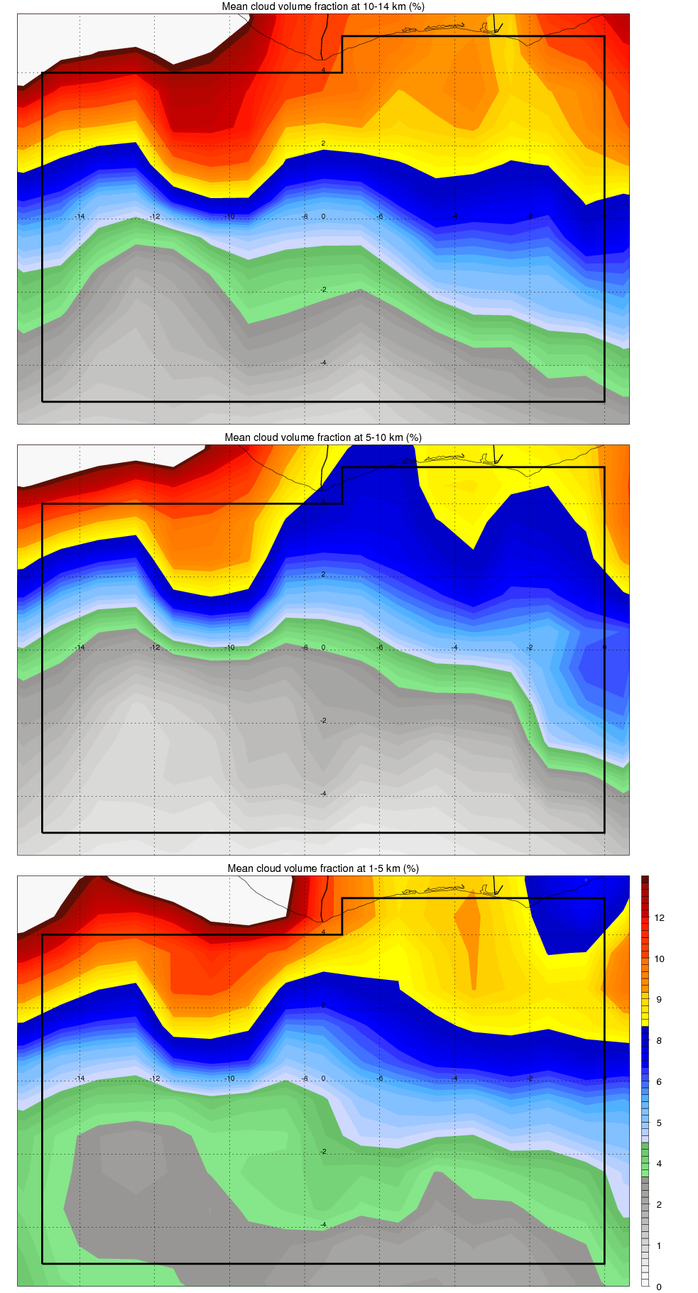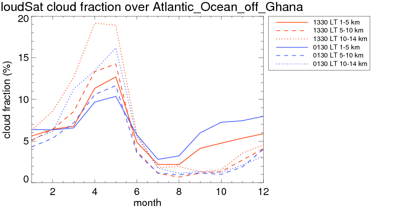 Over Atlantic_Ocean_off_Ghana , mean high level (10-14 km) cloud volume fraction is about 6.3%. Mean mid level (5-10 km) cloud volume fraction is about 4.6%. Mean low level (1-5 km) cloud volume fraction is about 6.1%. Seasonal and day vs. night variations of high, mid and low level cloud fraction over Atlantic_Ocean_off_Ghana are shown in following figure. You may check the details of cloud fraction in various seasons and at different local times. |
