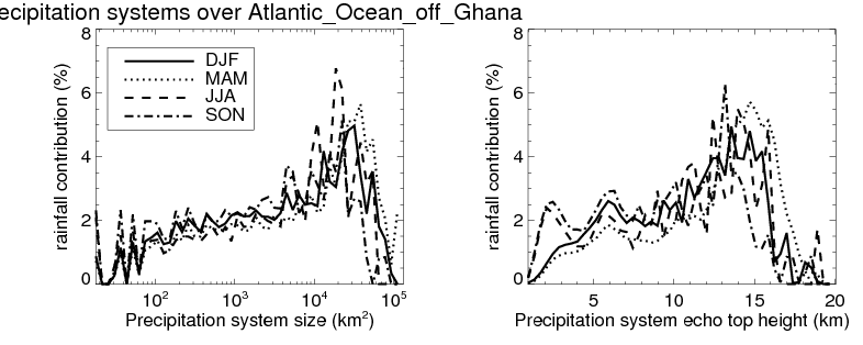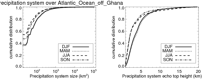 Over Atlantic_Ocean_off_Ghana , mean size of precipitation system about 210.7 (km^2) and mean maximum radar echo top height of these precipitation systems is about 4.2 km. Following figure shows the cumulative distribution of the sizes and depths of the precipitation systems in different seasons: Though usually there are more small systems, the larger systems would bring more total precipitation. |