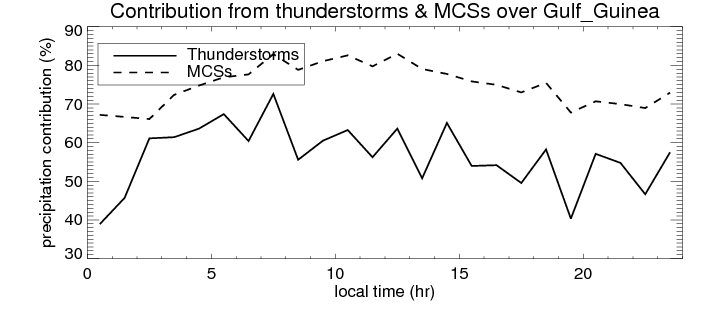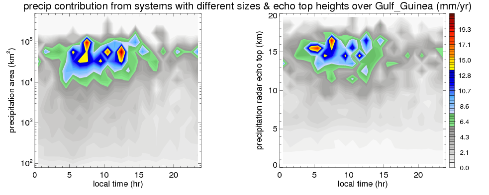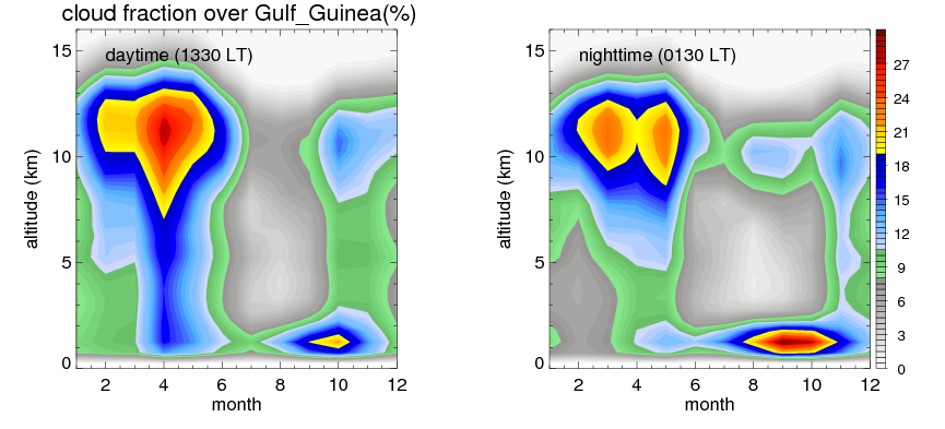 Many studies suggested that the diurnal variation of the precipitation is related to the life cycles of the precipitation systems, which is frequently driven by the surface sensible heating. Over Gulf_Guinea, mean annual precipitation are estimated with 1297.0 (mm/year) from precipitation radar. Detailed diurnal variation of the precipitation at high resolution can be accessed here (NOTE: it may take long time to generate for a large area). The diurnal variation of precipitation from systems with different sizes and heights are shown below: In total, thunderstorms (systems with detected lightning flashes) contribute 58 %, MCSs (Mesoscale convective systems with raining area > 2000 km^2) contribute 76 % of all precipitation over Gulf_Guinea. Diurnal variations of fraction of precipitation from thunderstorms and MCSs over Gulf_Guinea are shown below: Certainly there is a strong diurnal variation of different types of clouds. Because CloudSat observes at 0130 and 1330 local time, here the daytime and night cloud fraction in different seasons are presented: |