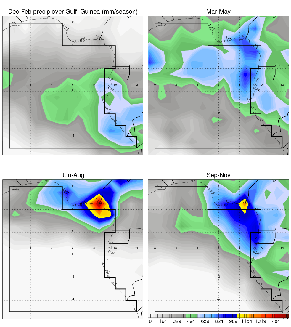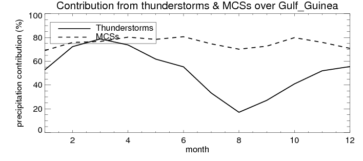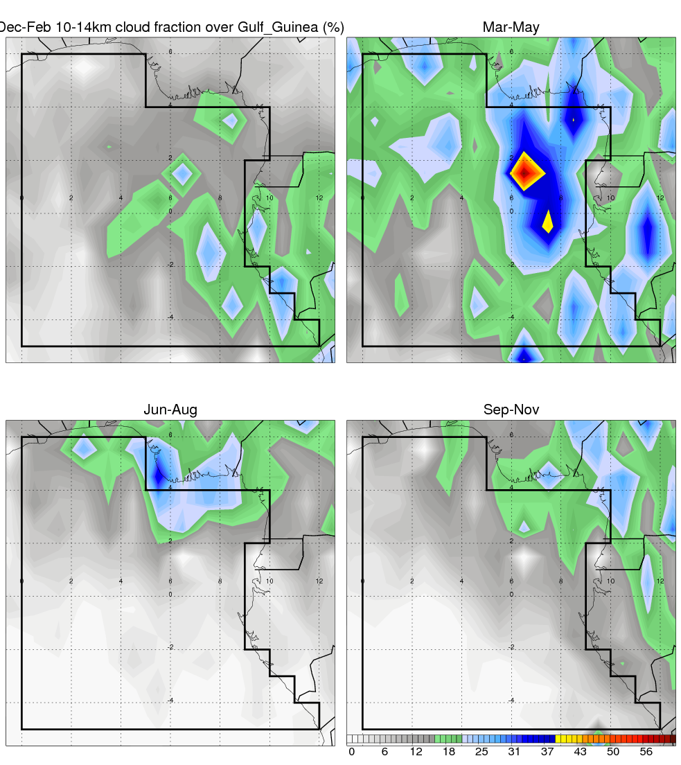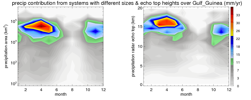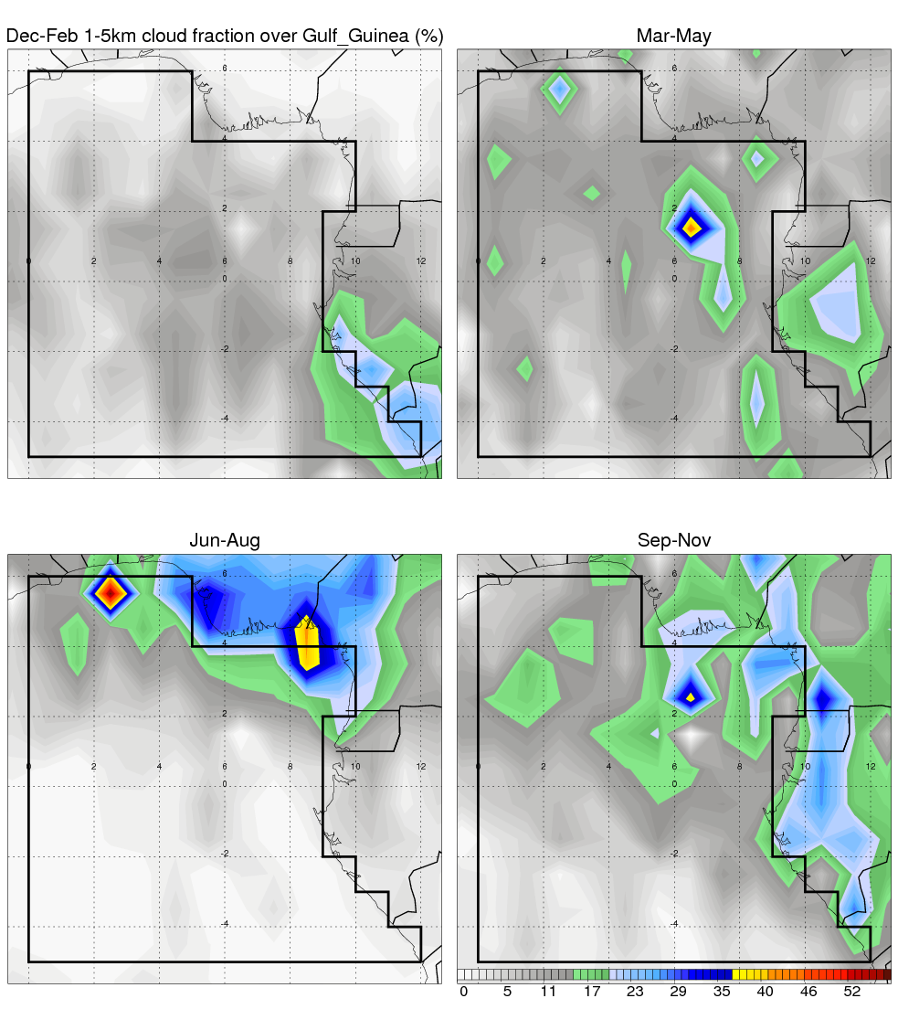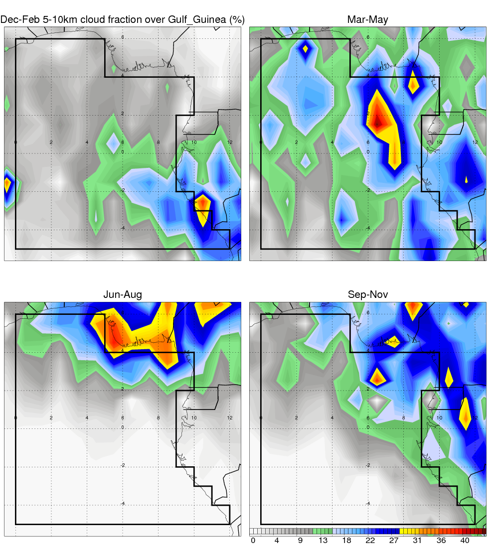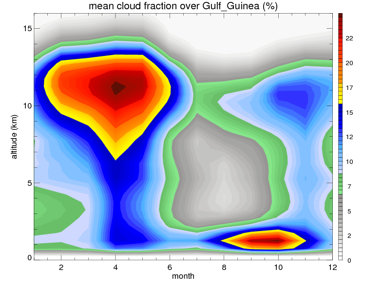 Over Gulf_Guinea , mean annual precipitation are estimated with 1297.0 (mm/year) from TRMM precipitation radar. (distribution of precipitation see here ) Total surface rainfall is brought by various precipitation systems. The seasonal variation of precipitation from systems with different sizes and heights are shown below: In total, thunderstorms (systems with detected lightning flashes) contribute 58 %, MCSs (Mesoscale convective systems with raining area > 2000 km^2) contribute 76 % of all precipitation. Seasonal variations of fraction of precipitation from thunderstorms and MCSs are shown below: The seasonal variation of geographical distribution of CloudSat cloud fraction over Gulf_Guinea is shown below: The seasonal variation of mean CloudSat level cloud fraction at different altitudes over Gulf_Guinea is shown below: |