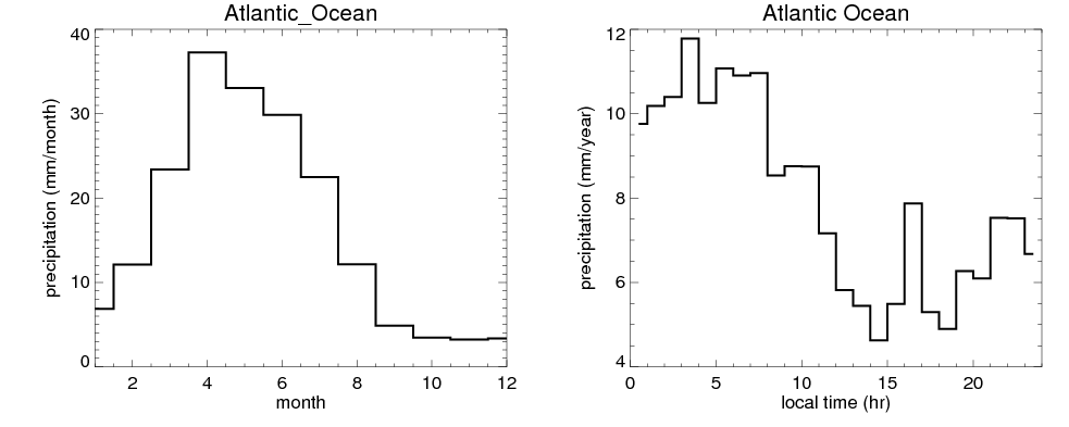 Over Atlantic_Ocean , mean annual precipitation are estimated with 192.0 (mm/year) from precipitation radar, and 267.9 (mm/year) from microwave radiometer observations. (see high resolution precipitation product , NOTE: it may take long time to generate for large area) In total, thunderstorms (systems with detected lightning flashes) contribute 2 %, MCSs (Mesoscale convective systems with raining area > 2000 km^2) contribute 26 % of all precipitation. Seasonal and diurnal variations of rainfall over Atlantic_Ocean are shown in following figure. You may check the details of rainfall contributions from precipitation systems with different sizes and intensities in various seasons and at different local times. |
