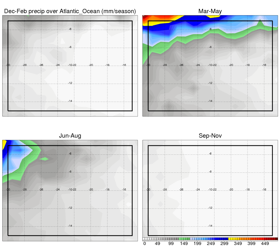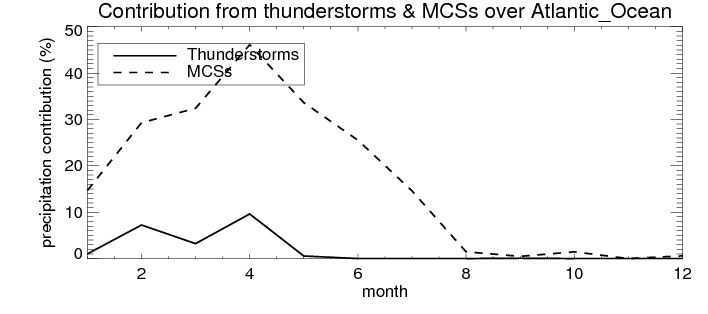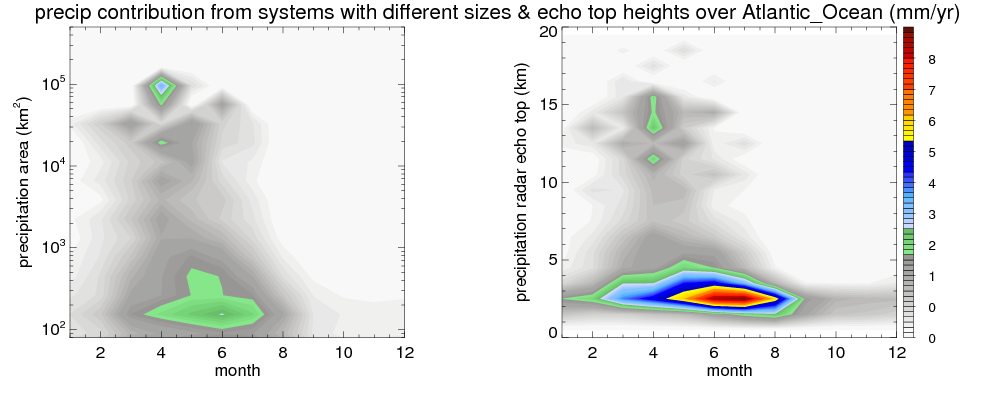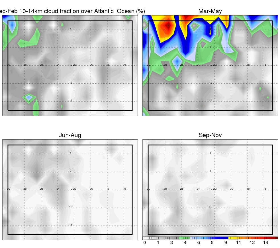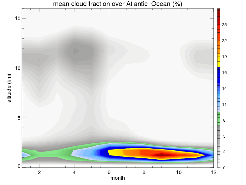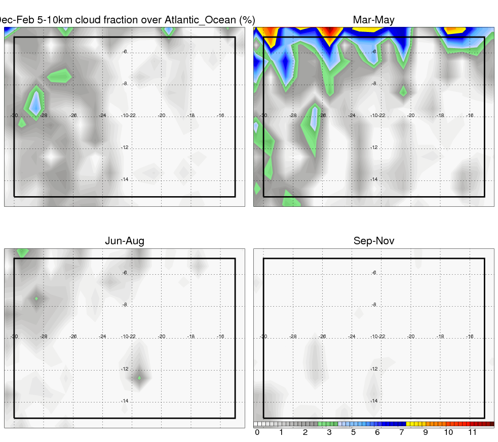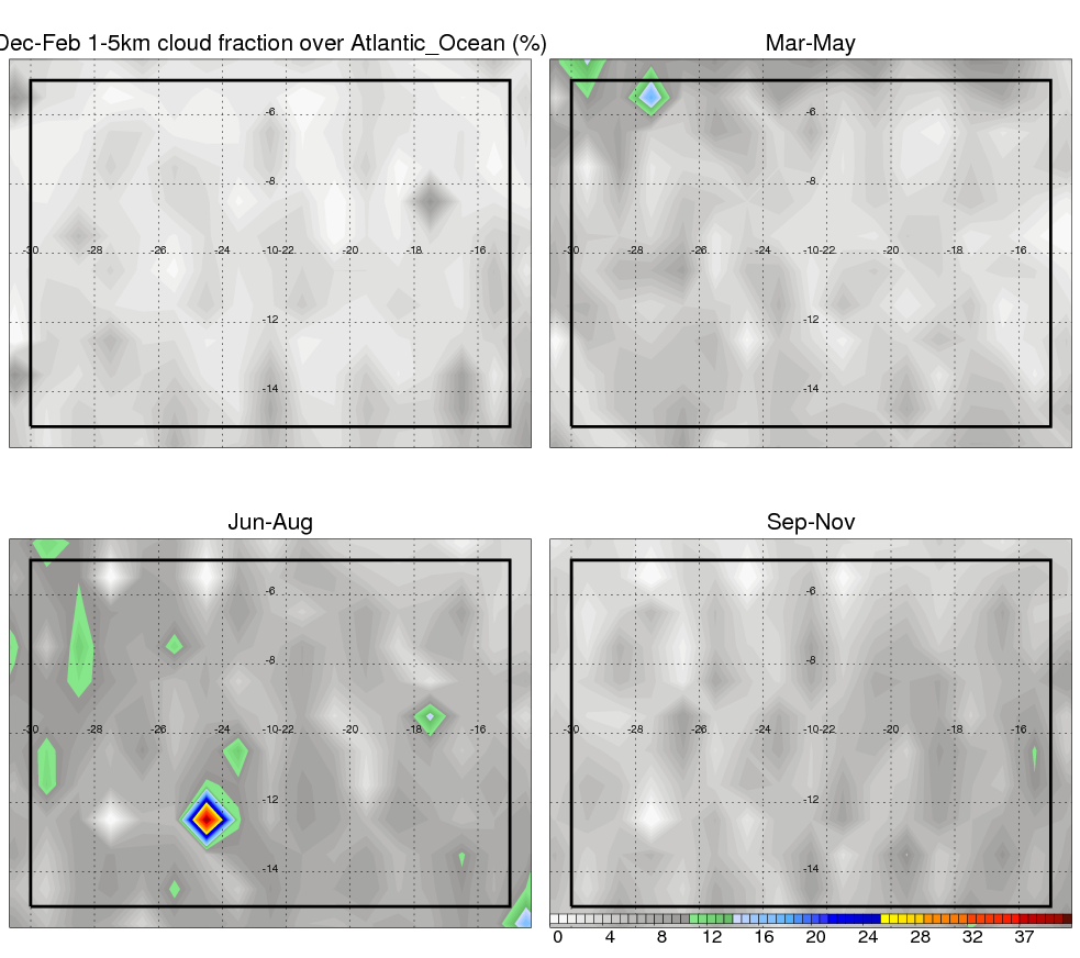 Over Atlantic_Ocean , mean annual precipitation are estimated with 192.0 (mm/year) from TRMM precipitation radar. (distribution of precipitation see here ) Total surface rainfall is brought by various precipitation systems. The seasonal variation of precipitation from systems with different sizes and heights are shown below: In total, thunderstorms (systems with detected lightning flashes) contribute 2 %, MCSs (Mesoscale convective systems with raining area > 2000 km^2) contribute 26 % of all precipitation. Seasonal variations of fraction of precipitation from thunderstorms and MCSs are shown below: The seasonal variation of geographical distribution of CloudSat cloud fraction over Atlantic_Ocean is shown below: The seasonal variation of mean CloudSat level cloud fraction at different altitudes over Atlantic_Ocean is shown below: |