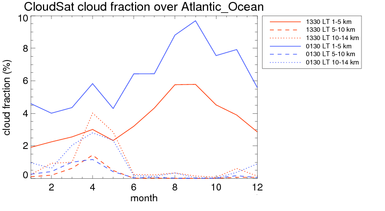 Over Atlantic_Ocean , mean high level (10-14 km) cloud volume fraction is about 0.8%. Mean mid level (5-10 km) cloud volume fraction is about 0.3%. Mean low level (1-5 km) cloud volume fraction is about 4.7%. Seasonal and day vs. night variations of high, mid and low level cloud fraction over Atlantic_Ocean are shown in following figure. You may check the details of cloud fraction in various seasons and at different local times. |