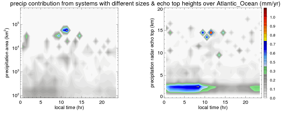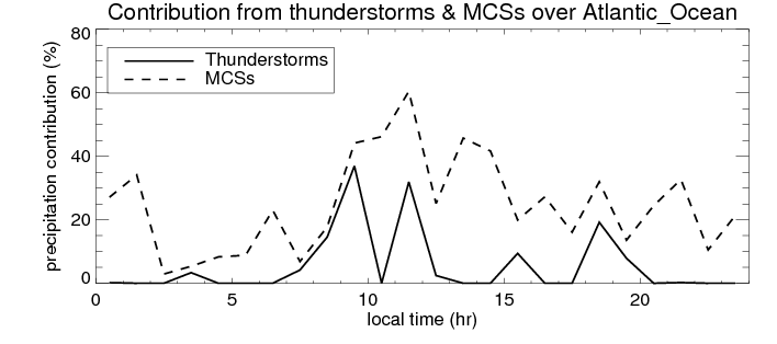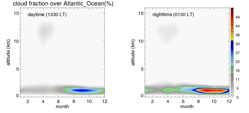 Many studies suggested that the diurnal variation of the precipitation is related to the life cycles of the precipitation systems, which is frequently driven by the surface sensible heating. Over Atlantic_Ocean, mean annual precipitation are estimated with 39.5 (mm/year) from precipitation radar. Detailed diurnal variation of the precipitation at high resolution can be accessed here (NOTE: it may take long time to generate for a large area). The diurnal variation of precipitation from systems with different sizes and heights are shown below: In total, thunderstorms (systems with detected lightning flashes) contribute 6 %, MCSs (Mesoscale convective systems with raining area > 2000 km^2) contribute 25 % of all precipitation over Atlantic_Ocean. Diurnal variations of fraction of precipitation from thunderstorms and MCSs over Atlantic_Ocean are shown below: Certainly there is a strong diurnal variation of different types of clouds. Because CloudSat observes at 0130 and 1330 local time, here the daytime and night cloud fraction in different seasons are presented: |