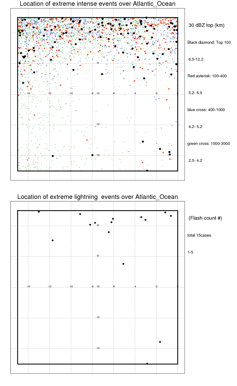 Following figure shows the location of the precipitation feautres categorized by the lightning rate and 30 dBZ echo top.