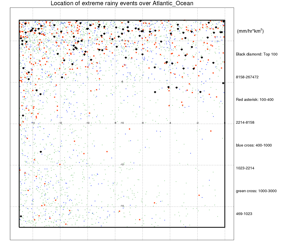 Following figure shows the location of the precipitation feautres categorized by the volumetric rainfall.