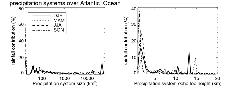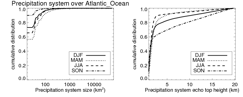 Over Atlantic_Ocean , mean size of precipitation system about 48.8 (km^2) and mean maximum radar echo top height of these precipitation systems is about 3.1 km. Following figure shows the cumulative distribution of the sizes and depths of the precipitation systems in different seasons: Though usually there are more small systems, the larger systems would bring more total precipitation. |
