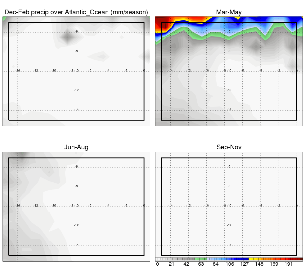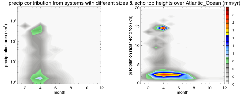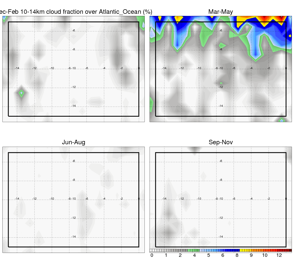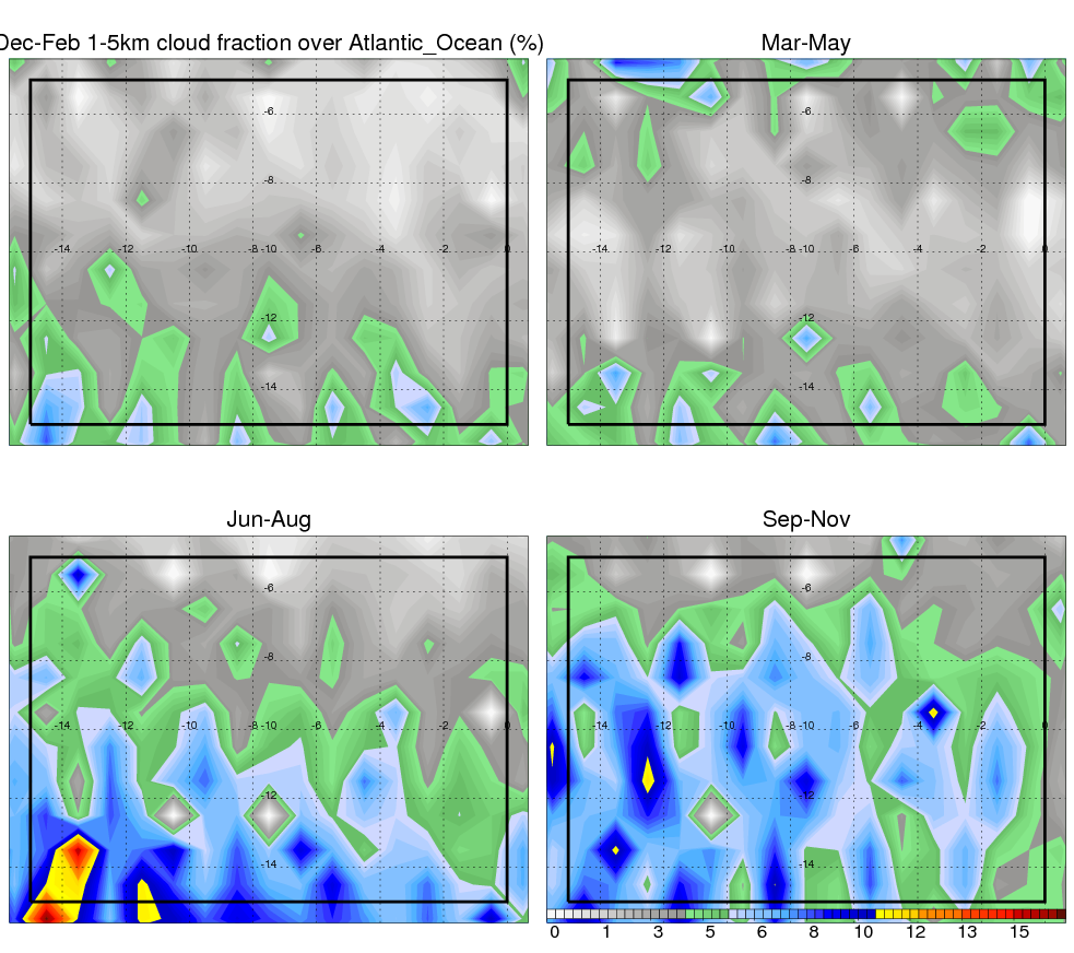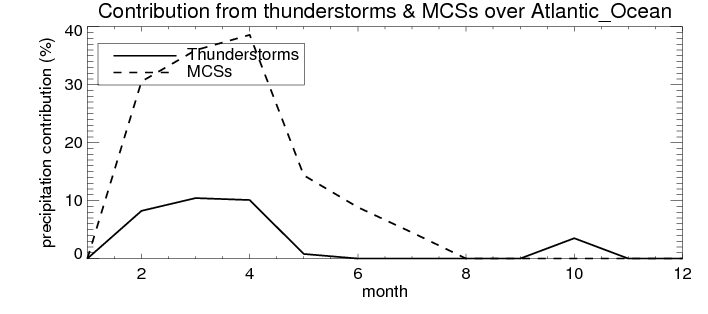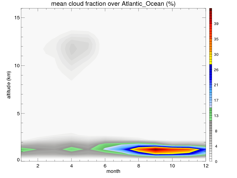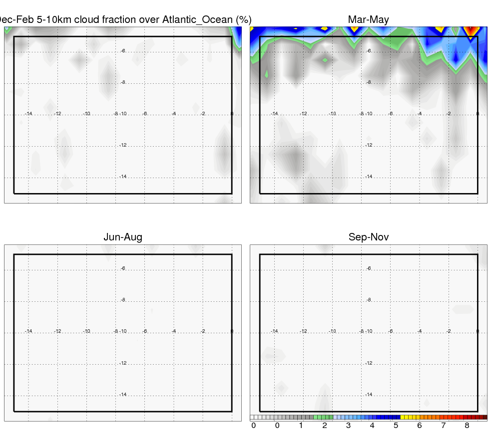 Over Atlantic_Ocean , mean annual precipitation are estimated with 39.5 (mm/year) from TRMM precipitation radar. (distribution of precipitation see here ) Total surface rainfall is brought by various precipitation systems. The seasonal variation of precipitation from systems with different sizes and heights are shown below: In total, thunderstorms (systems with detected lightning flashes) contribute 6 %, MCSs (Mesoscale convective systems with raining area > 2000 km^2) contribute 25 % of all precipitation. Seasonal variations of fraction of precipitation from thunderstorms and MCSs are shown below: The seasonal variation of geographical distribution of CloudSat cloud fraction over Atlantic_Ocean is shown below: The seasonal variation of mean CloudSat level cloud fraction at different altitudes over Atlantic_Ocean is shown below: |