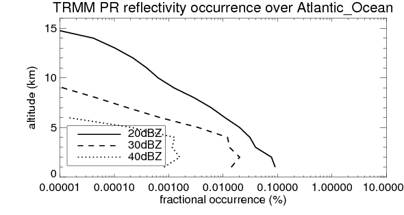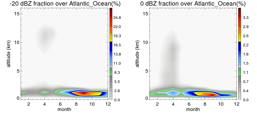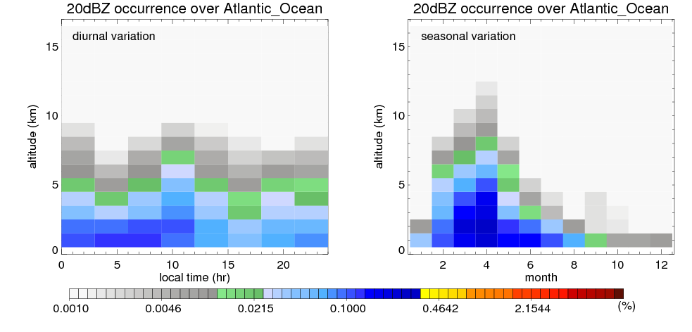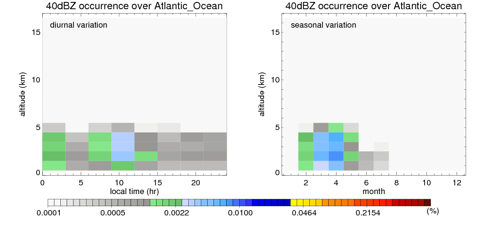 Here the precipitation means the precipitable hydrometeors (raindrops, snow flakes, graupel and hails) that detected by TRMM precipitation radar. Following figure shows the vertical profiles of 20, 30 and 40 dBZ fractional occurrence over Atlantic_Ocean in different seasons. The seasonal and diurnal variations of precipitation (20 dBZ) fractional occurrence at different altitudes are shown below: The seasonal and diurnal variations of INTENSIVE precipitation (40 dBZ) fractional occurrence at different altitudes are shown below: Clouds are consisted of small hydrometeors that undetectable by TRMM precipitation radar (Ku band). CloudSat (W band radar) provides the much great details of clouds. Following figure shows the vertical structure of the thin and thick clouds over Atlantic_Ocean. Note that high reflectivity at low levels are less frequent due to the attenuation. The seasonal variation of thin (-20 dBZ) and thick (0 dBZ) cloud over Atlantic_Ocean are shown below: |