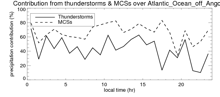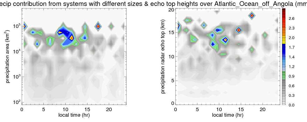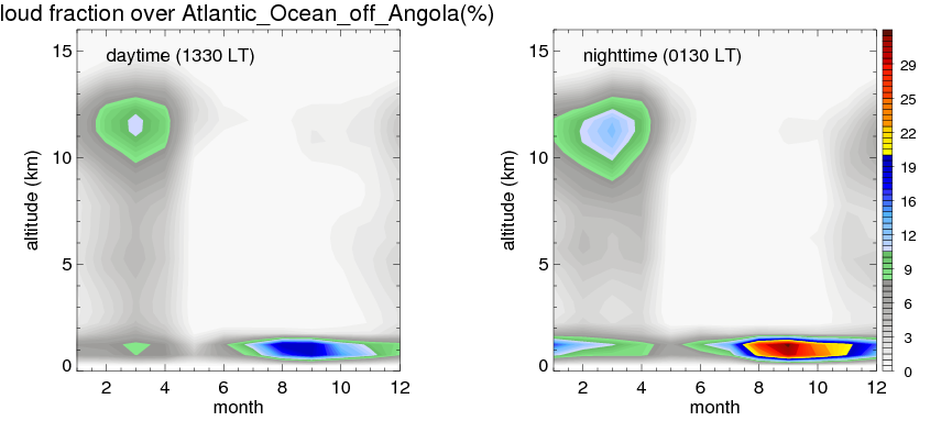 Many studies suggested that the diurnal variation of the precipitation is related to the life cycles of the precipitation systems, which is frequently driven by the surface sensible heating. Over Atlantic_Ocean_off_Angola, mean annual precipitation are estimated with 107.9 (mm/year) from precipitation radar. Detailed diurnal variation of the precipitation at high resolution can be accessed here (NOTE: it may take long time to generate for a large area). The diurnal variation of precipitation from systems with different sizes and heights are shown below: In total, thunderstorms (systems with detected lightning flashes) contribute 45 %, MCSs (Mesoscale convective systems with raining area > 2000 km^2) contribute 70 % of all precipitation over Atlantic_Ocean_off_Angola. Diurnal variations of fraction of precipitation from thunderstorms and MCSs over Atlantic_Ocean_off_Angola are shown below: Certainly there is a strong diurnal variation of different types of clouds. Because CloudSat observes at 0130 and 1330 local time, here the daytime and night cloud fraction in different seasons are presented: |