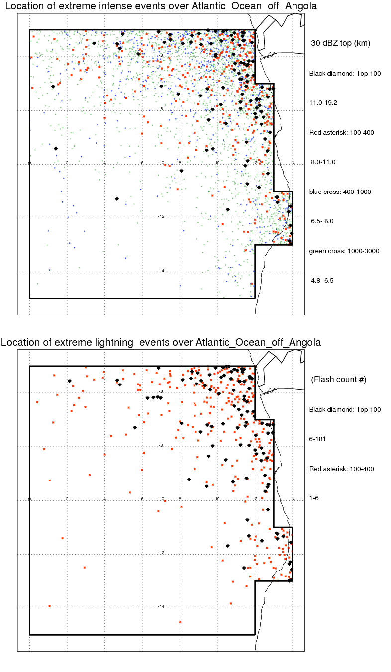 Following figure shows the location of the precipitation feautres categorized by the lightning rate and 30 dBZ echo top.