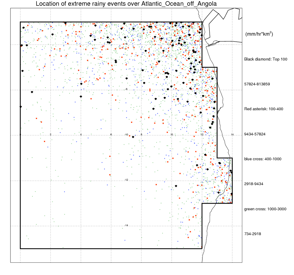 Following figure shows the location of the precipitation feautres categorized by the volumetric rainfall.