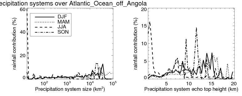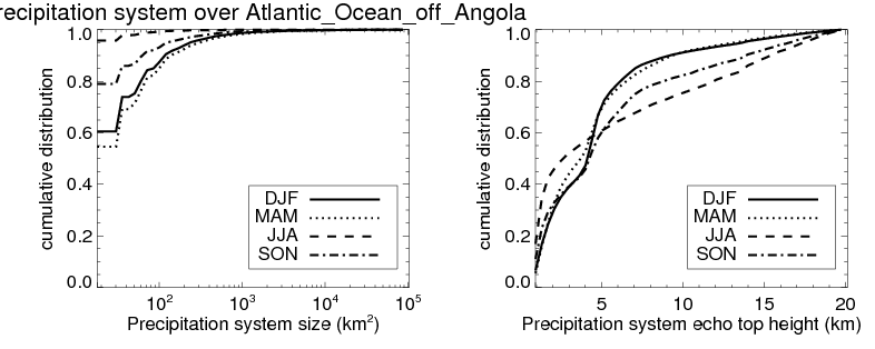 Over Atlantic_Ocean_off_Angola , mean size of precipitation system about 136.3 (km^2) and mean maximum radar echo top height of these precipitation systems is about 5.2 km. Following figure shows the cumulative distribution of the sizes and depths of the precipitation systems in different seasons: Though usually there are more small systems, the larger systems would bring more total precipitation. |