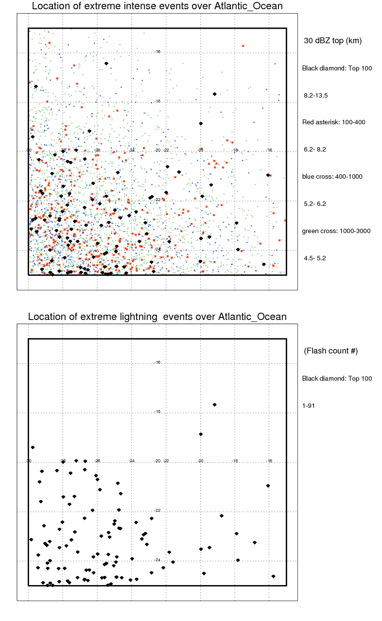 Following figure shows the location of the precipitation feautres categorized by the lightning rate and 30 dBZ echo top.