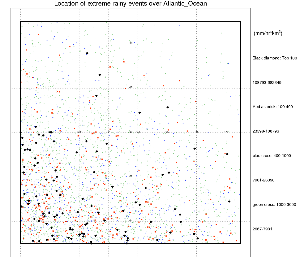 Following figure shows the location of the precipitation feautres categorized by the volumetric rainfall.