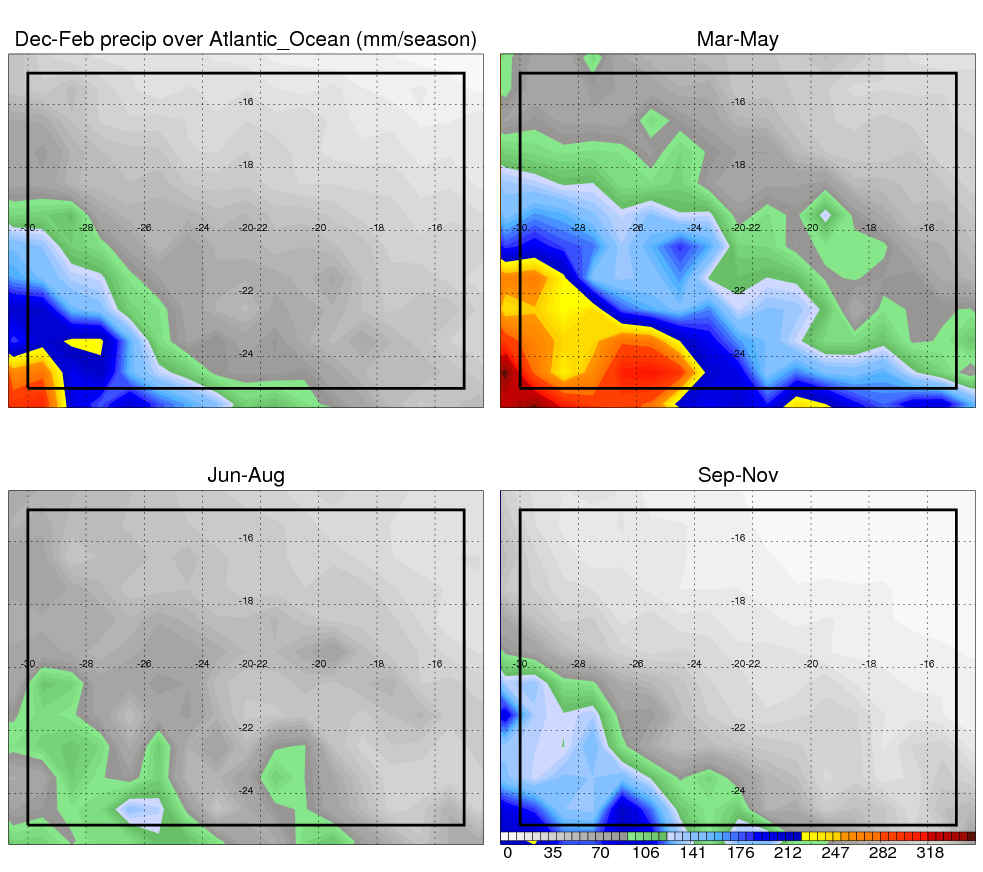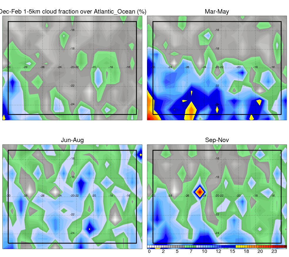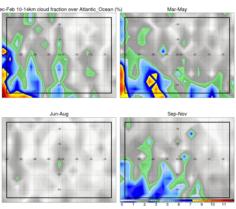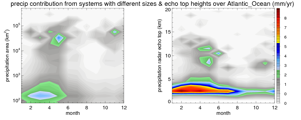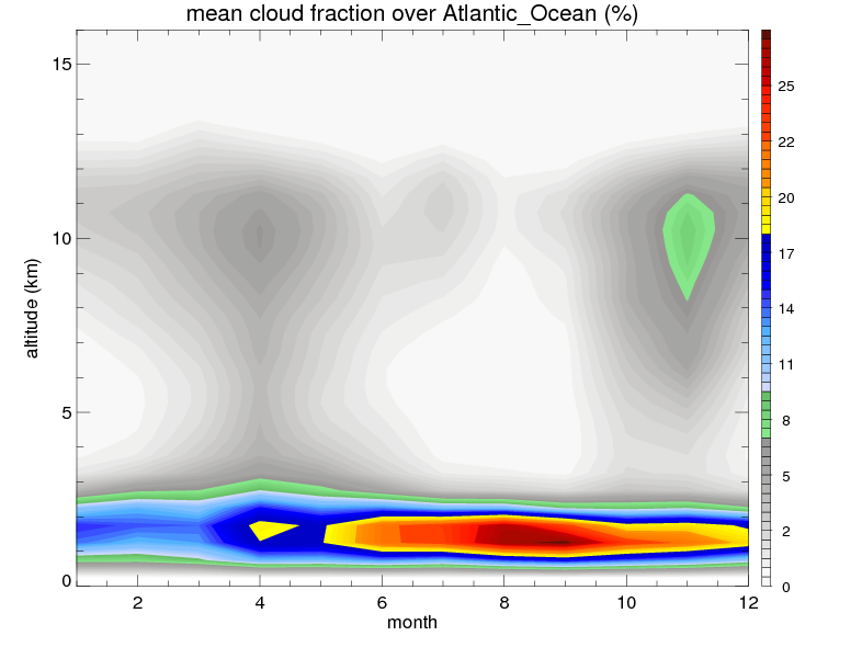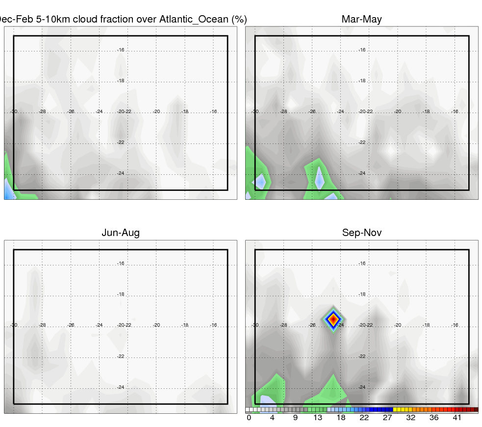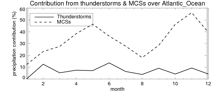 Over Atlantic_Ocean , mean annual precipitation are estimated with 297.2 (mm/year) from TRMM precipitation radar. (distribution of precipitation see here ) Total surface rainfall is brought by various precipitation systems. The seasonal variation of precipitation from systems with different sizes and heights are shown below: In total, thunderstorms (systems with detected lightning flashes) contribute 7 %, MCSs (Mesoscale convective systems with raining area > 2000 km^2) contribute 34 % of all precipitation. Seasonal variations of fraction of precipitation from thunderstorms and MCSs are shown below: The seasonal variation of geographical distribution of CloudSat cloud fraction over Atlantic_Ocean is shown below: The seasonal variation of mean CloudSat level cloud fraction at different altitudes over Atlantic_Ocean is shown below: |