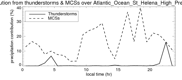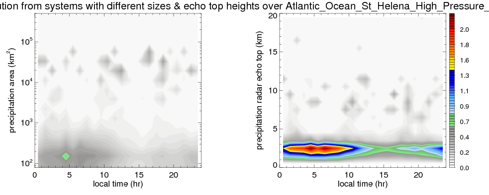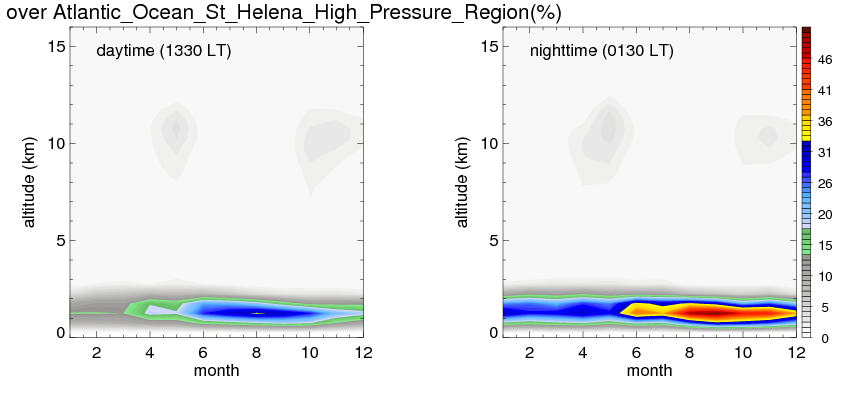 Many studies suggested that the diurnal variation of the precipitation is related to the life cycles of the precipitation systems, which is frequently driven by the surface sensible heating. Over Atlantic_Ocean_St_Helena_High_Pressure_Region , mean annual precipitation are estimated with 74.8 (mm/year) from precipitation radar. Detailed diurnal variation of the precipitation at high resolution can be accessed here (NOTE: it may take long time to generate for a large area). The diurnal variation of precipitation from systems with different sizes and heights are shown below: In total, thunderstorms (systems with detected lightning flashes) contribute 1 %, MCSs (Mesoscale convective systems with raining area > 2000 km^2) contribute 16 % of all precipitation over Atlantic_Ocean_St_Helena_High_Pressure_Region. Diurnal variations of fraction of precipitation from thunderstorms and MCSs over Atlantic_Ocean_St_Helena_High_Pressure_Region are shown below: Certainly there is a strong diurnal variation of different types of clouds. Because CloudSat observes at 0130 and 1330 local time, here the daytime and night cloud fraction in different seasons are presented: |