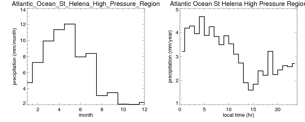 Over Atlantic_Ocean_St_Helena_High_Pressure_Region , mean annual precipitation are estimated with 74.8 (mm/year) from precipitation radar, and 107.6 (mm/year) from microwave radiometer observations. (see high resolution precipitation product , NOTE: it may take long time to generate for large area) In total, thunderstorms (systems with detected lightning flashes) contribute 1 %, MCSs (Mesoscale convective systems with raining area > 2000 km^2) contribute 16 % of all precipitation. Seasonal and diurnal variations of rainfall over Atlantic_Ocean_St_Helena_High_Pressure_Region are shown in following figure. You may check the details of rainfall contributions from precipitation systems with different sizes and intensities in various seasons and at different local times. |