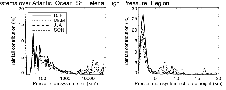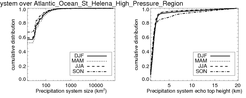 Over Atlantic_Ocean_St_Helena_High_Pressure_Region , mean size of precipitation system about 52.5 (km^2) and mean maximum radar echo top height of these precipitation systems is about 2.5 km. Following figure shows the cumulative distribution of the sizes and depths of the precipitation systems in different seasons: Though usually there are more small systems, the larger systems would bring more total precipitation. |