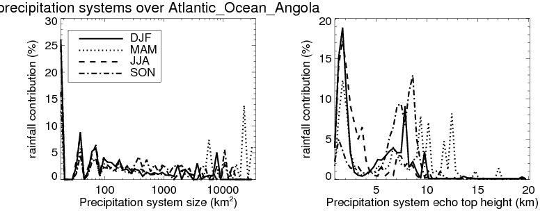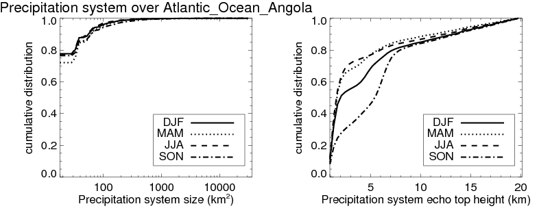 Over Atlantic_Ocean_Angola , mean size of precipitation system about 45.7 (km^2) and mean maximum radar echo top height of these precipitation systems is about 4.8 km. Following figure shows the cumulative distribution of the sizes and depths of the precipitation systems in different seasons: Though usually there are more small systems, the larger systems would bring more total precipitation. |