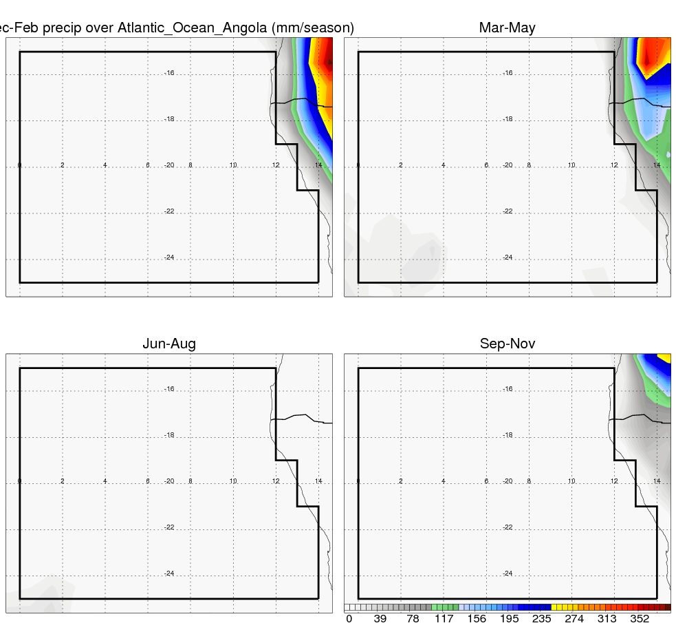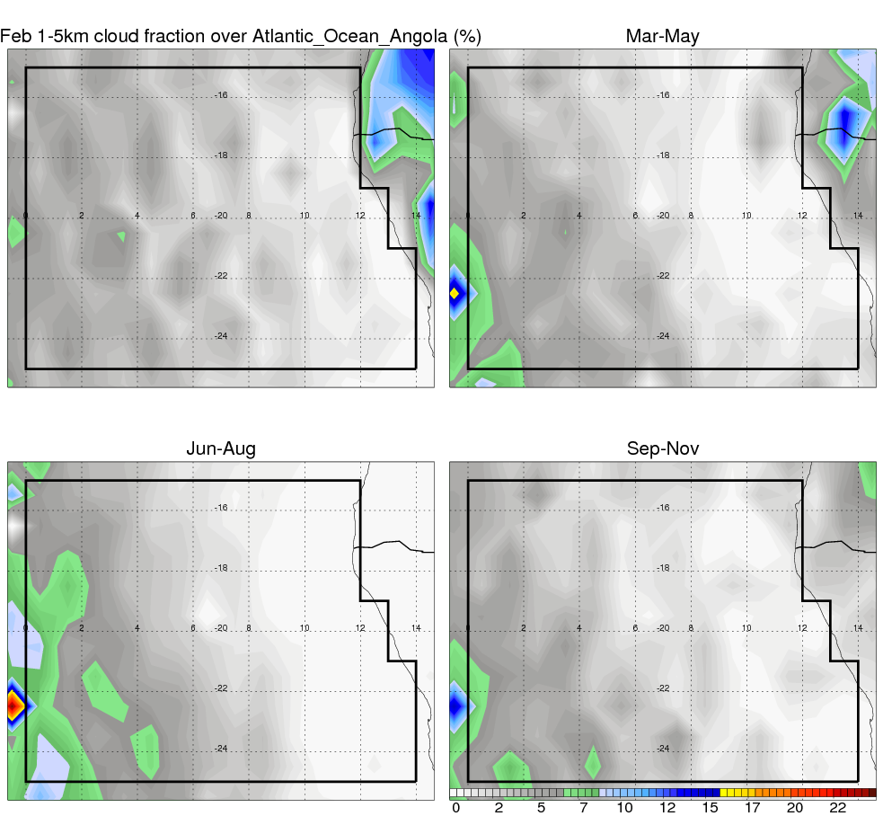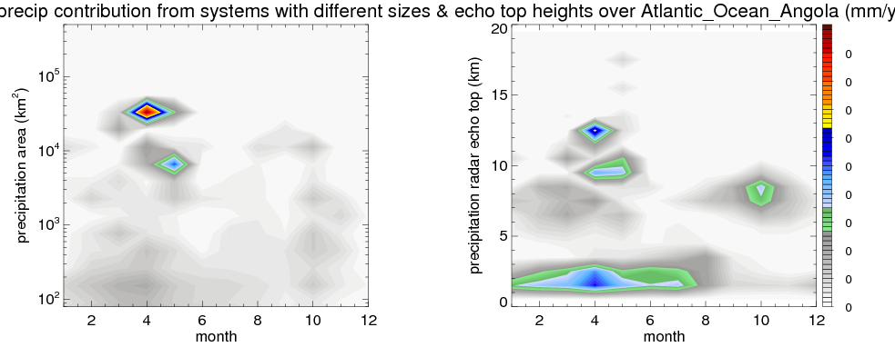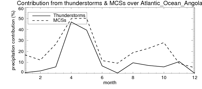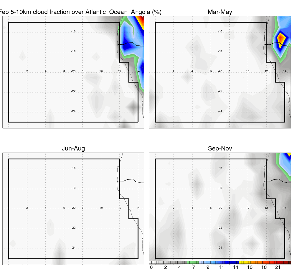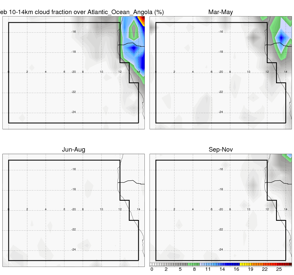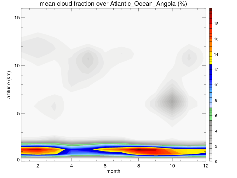 Over Atlantic_Ocean_Angola , mean annual precipitation are estimated with 11.2 (mm/year) from TRMM precipitation radar. (distribution of precipitation see here ) Total surface rainfall is brought by various precipitation systems. The seasonal variation of precipitation from systems with different sizes and heights are shown below: In total, thunderstorms (systems with detected lightning flashes) contribute 18 %, MCSs (Mesoscale convective systems with raining area > 2000 km^2) contribute 28 % of all precipitation. Seasonal variations of fraction of precipitation from thunderstorms and MCSs are shown below: The seasonal variation of geographical distribution of CloudSat cloud fraction over Atlantic_Ocean_Angola is shown below: The seasonal variation of mean CloudSat level cloud fraction at different altitudes over Atlantic_Ocean_Angola is shown below: |