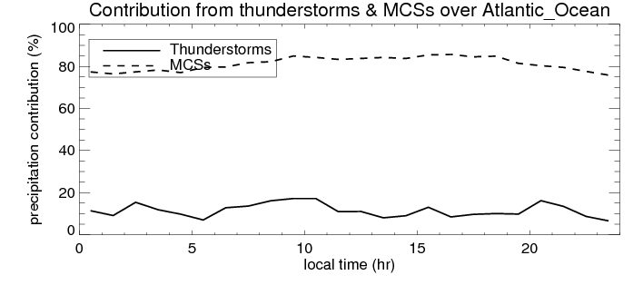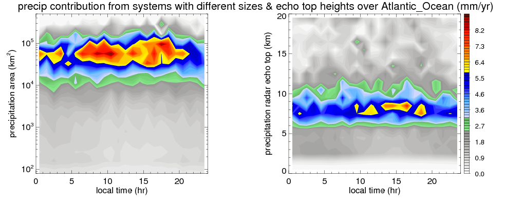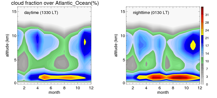 Many studies suggested that the diurnal variation of the precipitation is related to the life cycles of the precipitation systems, which is frequently driven by the surface sensible heating. Over Atlantic_Ocean, mean annual precipitation are estimated with 913.4 (mm/year) from precipitation radar. Detailed diurnal variation of the precipitation at high resolution can be accessed here (NOTE: it may take long time to generate for a large area). The diurnal variation of precipitation from systems with different sizes and heights are shown below: In total, thunderstorms (systems with detected lightning flashes) contribute 11 %, MCSs (Mesoscale convective systems with raining area > 2000 km^2) contribute 81 % of all precipitation over Atlantic_Ocean. Diurnal variations of fraction of precipitation from thunderstorms and MCSs over Atlantic_Ocean are shown below: Certainly there is a strong diurnal variation of different types of clouds. Because CloudSat observes at 0130 and 1330 local time, here the daytime and night cloud fraction in different seasons are presented: |