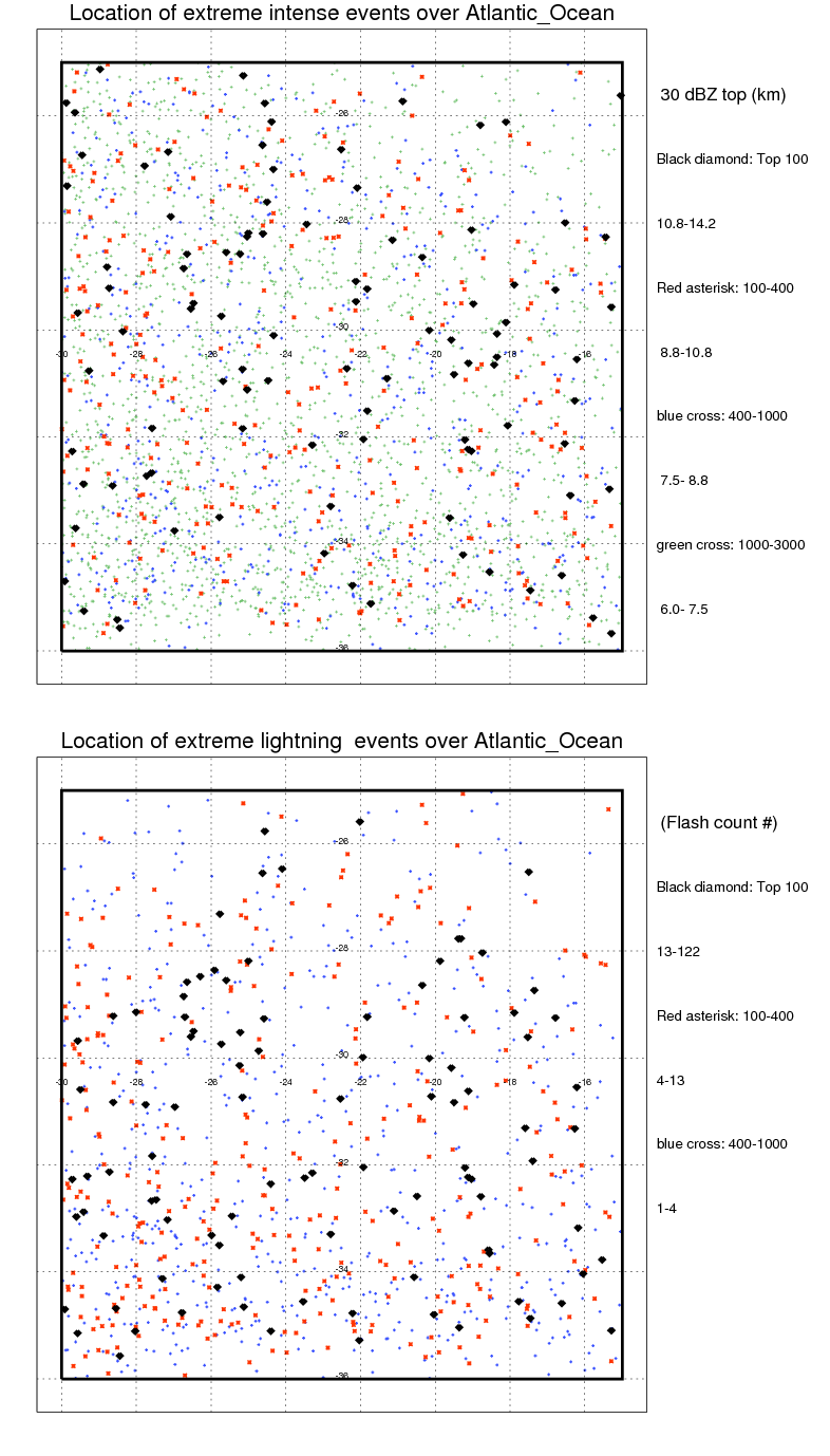 Following figure shows the location of the precipitation feautres categorized by the lightning rate and 30 dBZ echo top.