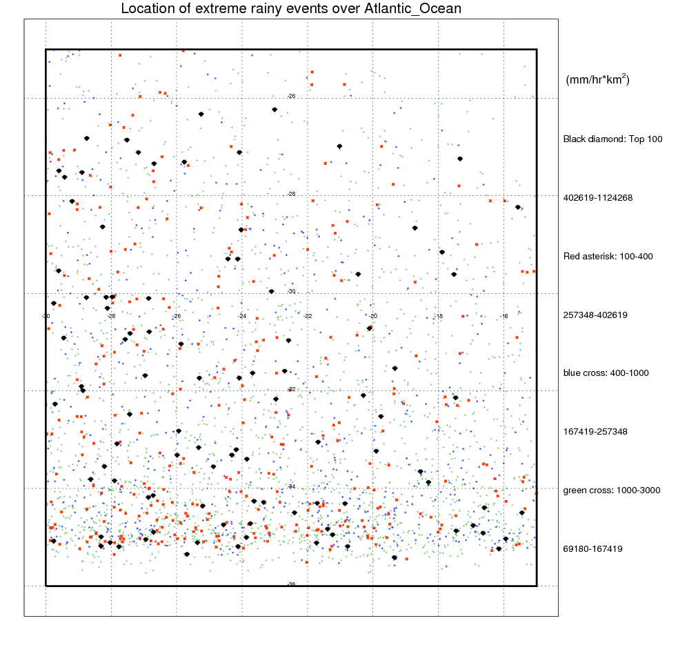 Following figure shows the location of the precipitation feautres categorized by the volumetric rainfall.