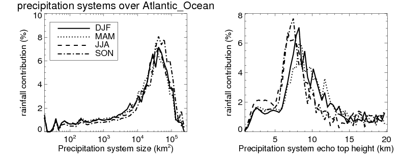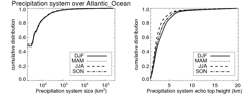 Over Atlantic_Ocean , mean size of precipitation system about 302.8 (km^2) and mean maximum radar echo top height of these precipitation systems is about 3.3 km. Following figure shows the cumulative distribution of the sizes and depths of the precipitation systems in different seasons: Though usually there are more small systems, the larger systems would bring more total precipitation. |