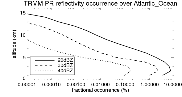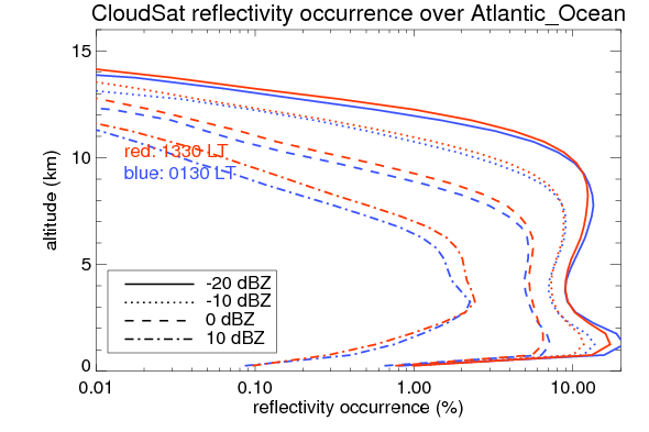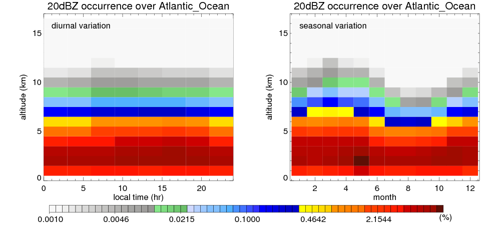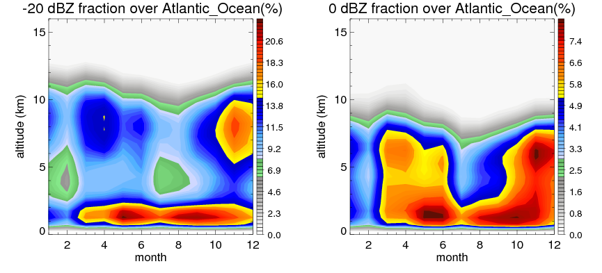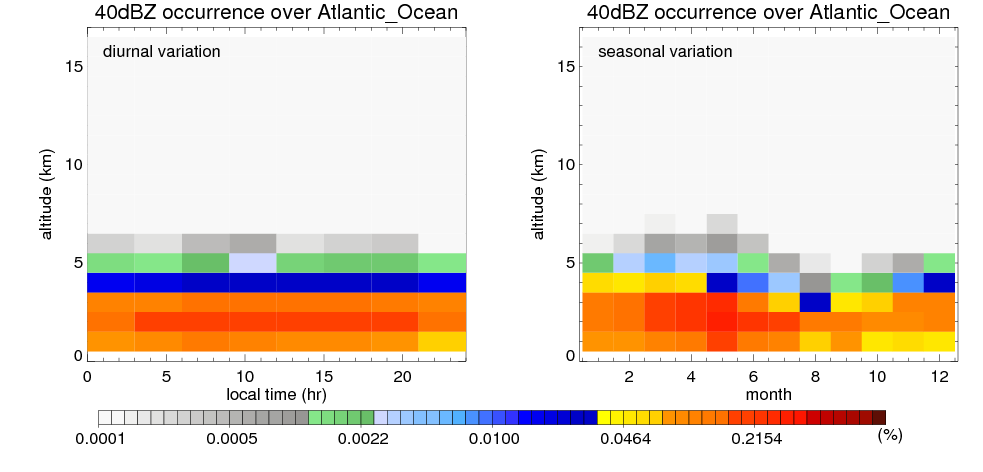 Here the precipitation means the precipitable hydrometeors (raindrops, snow flakes, graupel and hails) that detected by TRMM precipitation radar. Following figure shows the vertical profiles of 20, 30 and 40 dBZ fractional occurrence over Atlantic_Ocean in different seasons. The seasonal and diurnal variations of precipitation (20 dBZ) fractional occurrence at different altitudes are shown below: The seasonal and diurnal variations of INTENSIVE precipitation (40 dBZ) fractional occurrence at different altitudes are shown below: Clouds are consisted of small hydrometeors that undetectable by TRMM precipitation radar (Ku band). CloudSat (W band radar) provides the much great details of clouds. Following figure shows the vertical structure of the thin and thick clouds over Atlantic_Ocean. Note that high reflectivity at low levels are less frequent due to the attenuation. The seasonal variation of thin (-20 dBZ) and thick (0 dBZ) cloud over Atlantic_Ocean are shown below: |