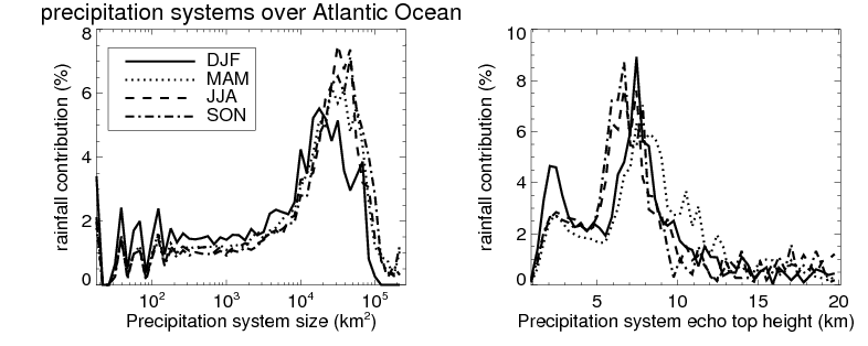 Over Atlantic Ocean , mean size of precipitation system about 215.0 (km^2) and mean maximum radar echo top height of these precipitation systems is about 3.1 km. Following figure shows the cumulative distribution of the sizes and depths of the precipitation systems in different seasons: Though usually there are more small systems, the larger systems would bring more total precipitation. |