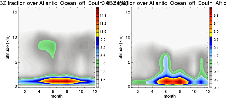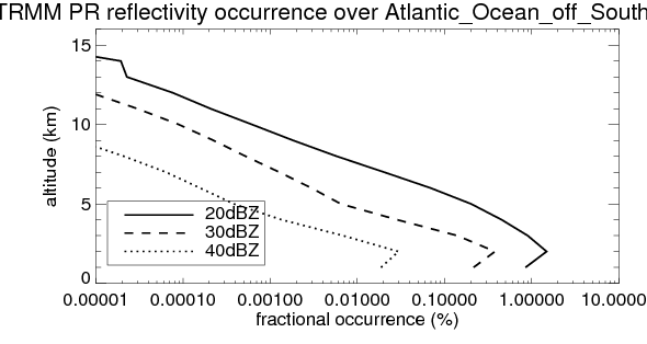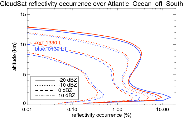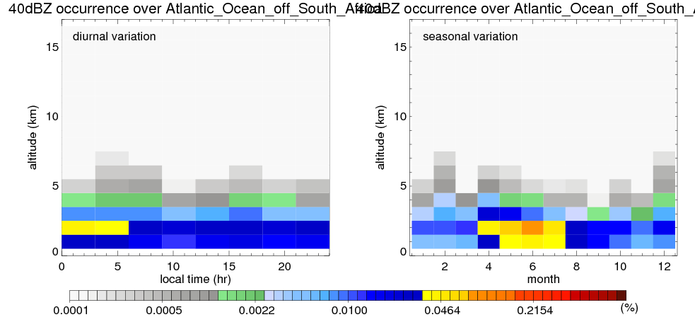 Here the precipitation means the precipitable hydrometeors (raindrops, snow flakes, graupel and hails) that detected by TRMM precipitation radar. Following figure shows the vertical profiles of 20, 30 and 40 dBZ fractional occurrence over Atlantic_Ocean_off_South_Africa in different seasons. The seasonal and diurnal variations of precipitation (20 dBZ) fractional occurrence at different altitudes are shown below: The seasonal and diurnal variations of INTENSIVE precipitation (40 dBZ) fractional occurrence at different altitudes are shown below: Clouds are consisted of small hydrometeors that undetectable by TRMM precipitation radar (Ku band). CloudSat (W band radar) provides the much great details of clouds. Following figure shows the vertical structure of the thin and thick clouds over Atlantic_Ocean_off_South_Africa. Note that high reflectivity at low levels are less frequent due to the attenuation. The seasonal variation of thin (-20 dBZ) and thick (0 dBZ) cloud over Atlantic_Ocean_off_South_Africa are shown below: |