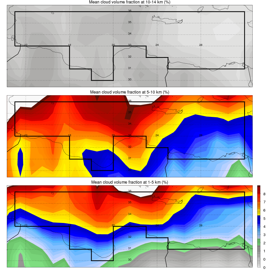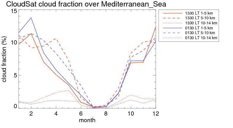 Over Mediterranean_Sea , mean high level (10-14 km) cloud volume fraction is about 1.1%. Mean mid level (5-10 km) cloud volume fraction is about 6.5%. Mean low level (1-5 km) cloud volume fraction is about 5.6%. Seasonal and day vs. night variations of high, mid and low level cloud fraction over Mediterranean_Sea are shown in following figure. You may check the details of cloud fraction in various seasons and at different local times. |