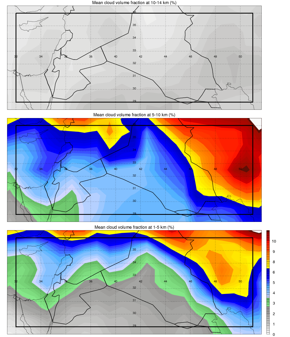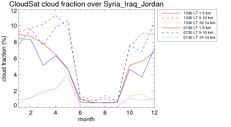 Over Syria_Iraq_Jordan , mean high level (10-14 km) cloud volume fraction is about 1.1%. Mean mid level (5-10 km) cloud volume fraction is about 6.2%. Mean low level (1-5 km) cloud volume fraction is about 4.4%. Seasonal and day vs. night variations of high, mid and low level cloud fraction over Syria_Iraq_Jordan are shown in following figure. You may check the details of cloud fraction in various seasons and at different local times. |