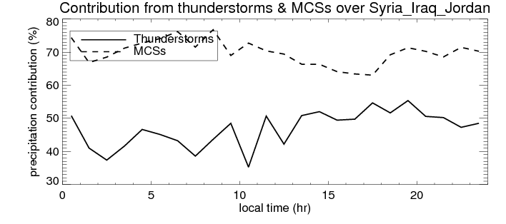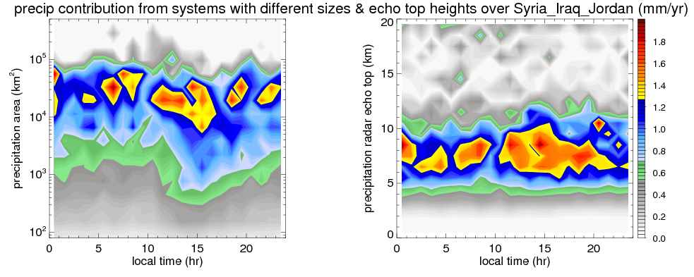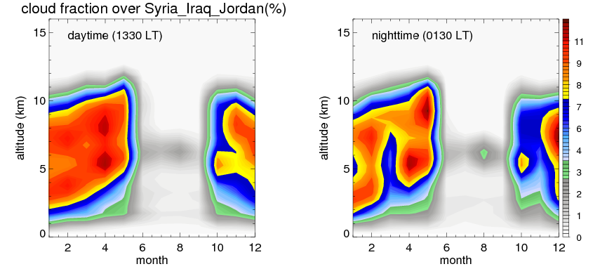 Many studies suggested that the diurnal variation of the precipitation is related to the life cycles of the precipitation systems, which is frequently driven by the surface sensible heating. Over Syria_Iraq_Jordan, mean annual precipitation are estimated with 242.9 (mm/year) from precipitation radar. Detailed diurnal variation of the precipitation at high resolution can be accessed here (NOTE: it may take long time to generate for a large area). The diurnal variation of precipitation from systems with different sizes and heights are shown below: In total, thunderstorms (systems with detected lightning flashes) contribute 47 %, MCSs (Mesoscale convective systems with raining area > 2000 km^2) contribute 70 % of all precipitation over Syria_Iraq_Jordan. Diurnal variations of fraction of precipitation from thunderstorms and MCSs over Syria_Iraq_Jordan are shown below: Certainly there is a strong diurnal variation of different types of clouds. Because CloudSat observes at 0130 and 1330 local time, here the daytime and night cloud fraction in different seasons are presented: |