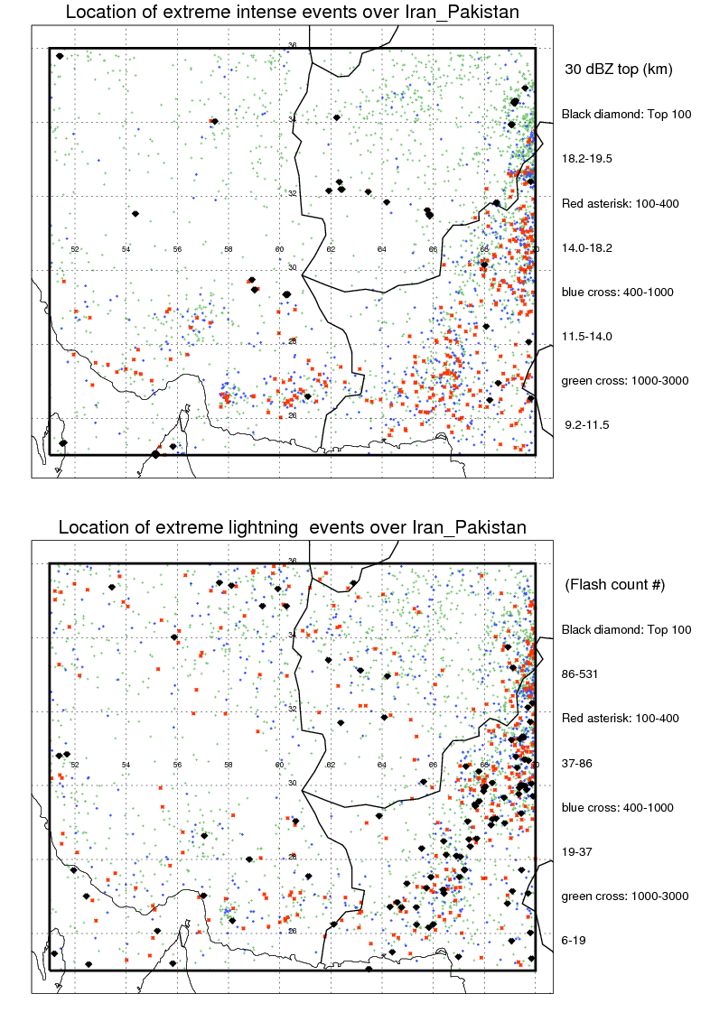Following figure shows the location of the precipitation feautres categorized by the lightning rate and 30 dBZ echo top.