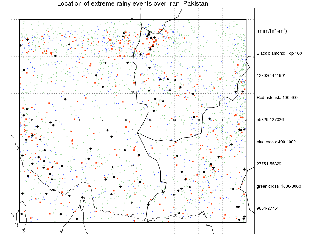 Following figure shows the location of the precipitation feautres categorized by the volumetric rainfall.