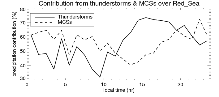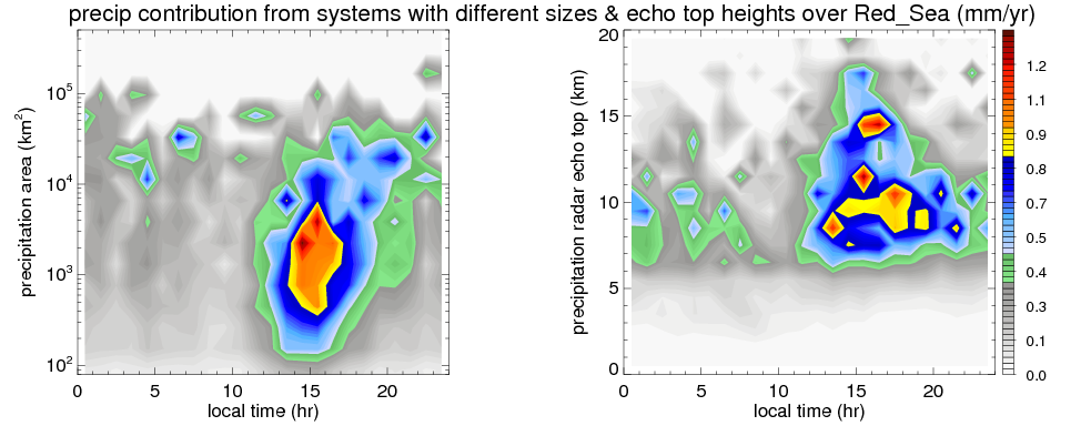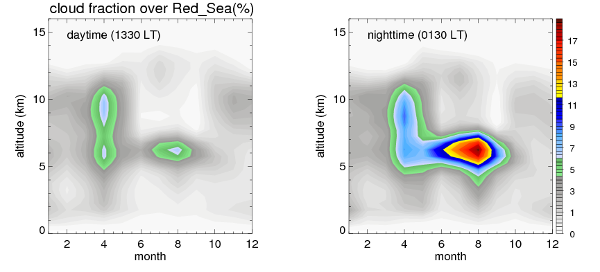 Many studies suggested that the diurnal variation of the precipitation is related to the life cycles of the precipitation systems, which is frequently driven by the surface sensible heating. Over Red_Sea, mean annual precipitation are estimated with 112.1 (mm/year) from precipitation radar. Detailed diurnal variation of the precipitation at high resolution can be accessed here (NOTE: it may take long time to generate for a large area). The diurnal variation of precipitation from systems with different sizes and heights are shown below: In total, thunderstorms (systems with detected lightning flashes) contribute 60 %, MCSs (Mesoscale convective systems with raining area > 2000 km^2) contribute 54 % of all precipitation over Red_Sea. Diurnal variations of fraction of precipitation from thunderstorms and MCSs over Red_Sea are shown below: Certainly there is a strong diurnal variation of different types of clouds. Because CloudSat observes at 0130 and 1330 local time, here the daytime and night cloud fraction in different seasons are presented: |