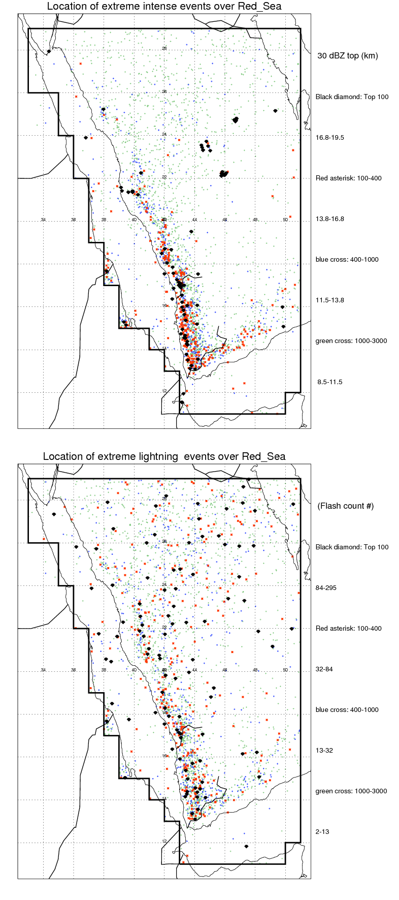 Following figure shows the location of the precipitation feautres categorized by the lightning rate and 30 dBZ echo top.