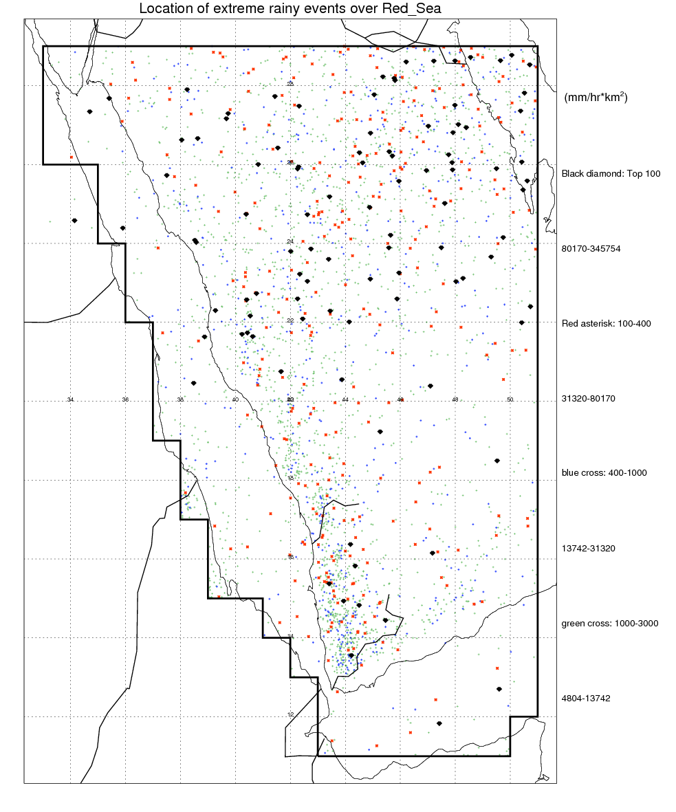 Following figure shows the location of the precipitation feautres categorized by the volumetric rainfall.