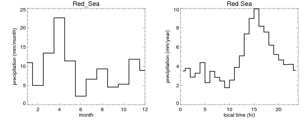 Over Red_Sea , mean annual precipitation are estimated with 112.1 (mm/year) from precipitation radar, and 78.9 (mm/year) from microwave radiometer observations. (see high resolution precipitation product , NOTE: it may take long time to generate for large area) In total, thunderstorms (systems with detected lightning flashes) contribute 60 %, MCSs (Mesoscale convective systems with raining area > 2000 km^2) contribute 54 % of all precipitation. Seasonal and diurnal variations of rainfall over Red_Sea are shown in following figure. You may check the details of rainfall contributions from precipitation systems with different sizes and intensities in various seasons and at different local times. |
