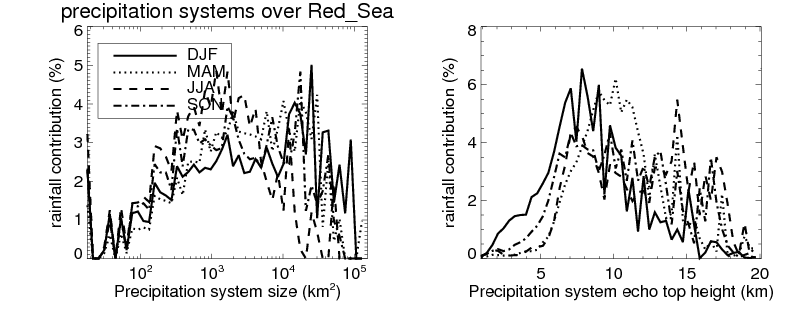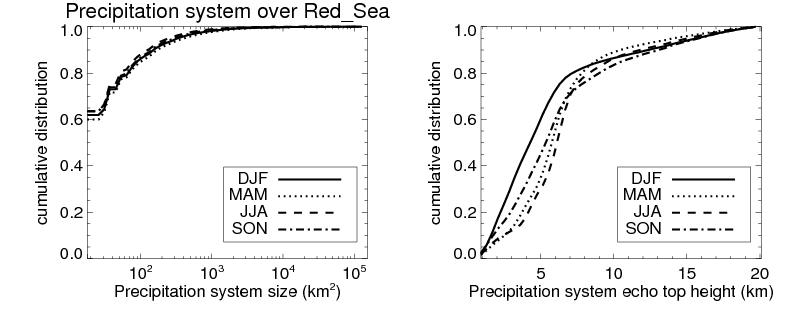 Over Red_Sea , mean size of precipitation system about 147.8 (km^2) and mean maximum radar echo top height of these precipitation systems is about 6.6 km. Following figure shows the cumulative distribution of the sizes and depths of the precipitation systems in different seasons: Though usually there are more small systems, the larger systems would bring more total precipitation. |