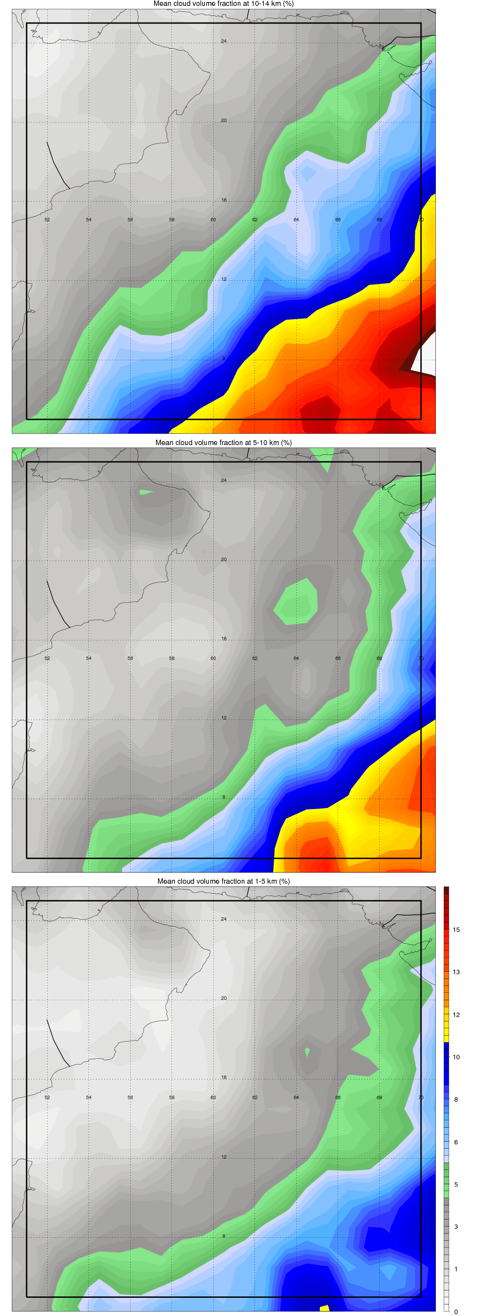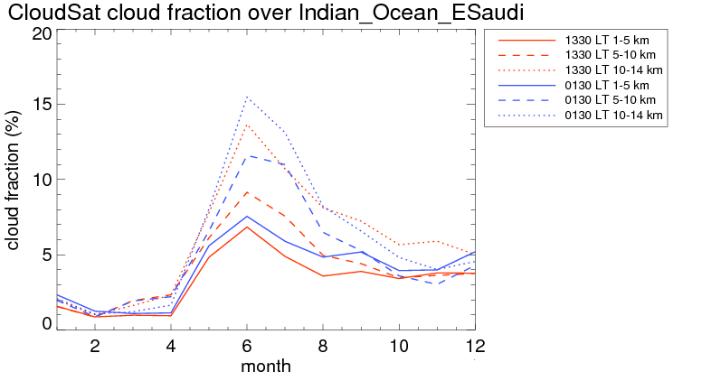 Over Indian_Ocean_ESaudi , mean high level (10-14 km) cloud volume fraction is about 6.0%. Mean mid level (5-10 km) cloud volume fraction is about 4.5%. Mean low level (1-5 km) cloud volume fraction is about 3.6%. Seasonal and day vs. night variations of high, mid and low level cloud fraction over Indian_Ocean_ESaudi are shown in following figure. You may check the details of cloud fraction in various seasons and at different local times. |