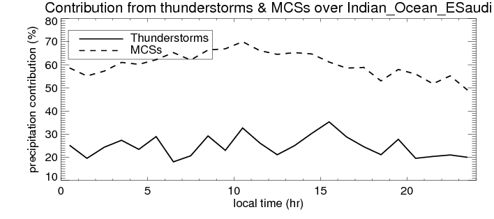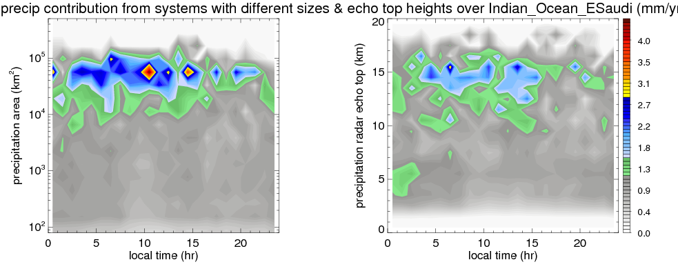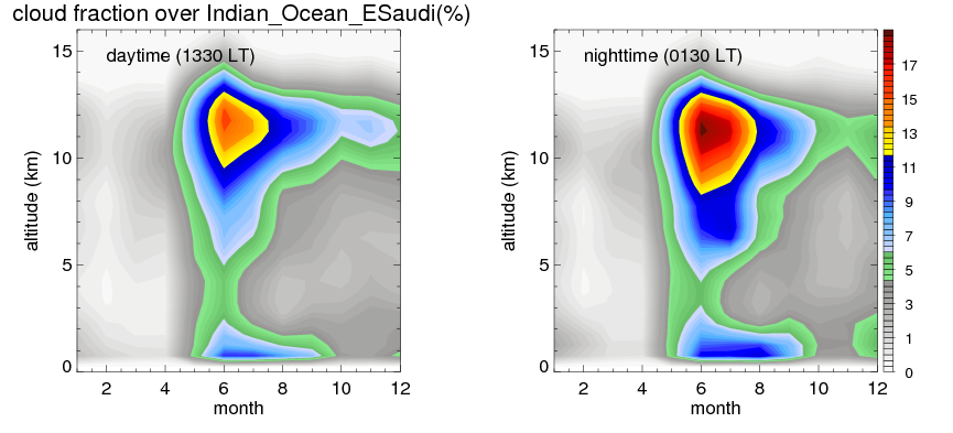Many studies suggested that the diurnal variation of the precipitation is related to the life cycles of the precipitation systems, which is frequently driven by the surface sensible heating. Over Indian_Ocean_ESaudi, mean annual precipitation are estimated with 398.7 (mm/year) from precipitation radar. Detailed diurnal variation of the precipitation at high resolution can be accessed here (NOTE: it may take long time to generate for a large area). The diurnal variation of precipitation from systems with different sizes and heights are shown below: In total, thunderstorms (systems with detected lightning flashes) contribute 24 %, MCSs (Mesoscale convective systems with raining area > 2000 km^2) contribute 60 % of all precipitation over Indian_Ocean_ESaudi. Diurnal variations of fraction of precipitation from thunderstorms and MCSs over Indian_Ocean_ESaudi are shown below: Certainly there is a strong diurnal variation of different types of clouds. Because CloudSat observes at 0130 and 1330 local time, here the daytime and night cloud fraction in different seasons are presented: |